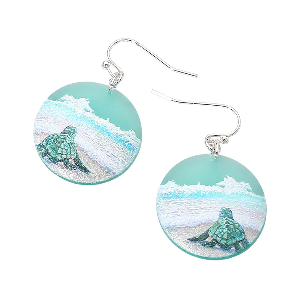 Details • Size : 1" X 1.5" • Fish Hook Back • Charming beach-themed drop earrings featuring a peaceful sea turtle motif set on smooth round discs. Lightweight and easy to wear, they bring a serene coastal vibe to any outfit. A perfect accessory for ocean lovers, vacation style, or gifting someone who enjoys seaside-inspired jewelry. • Lead and Nickel Compliant