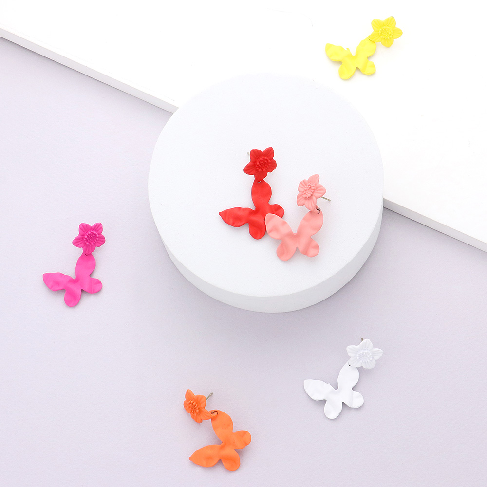 Crushed Colored Metal Flower Butterfly Link Dangle Earrings