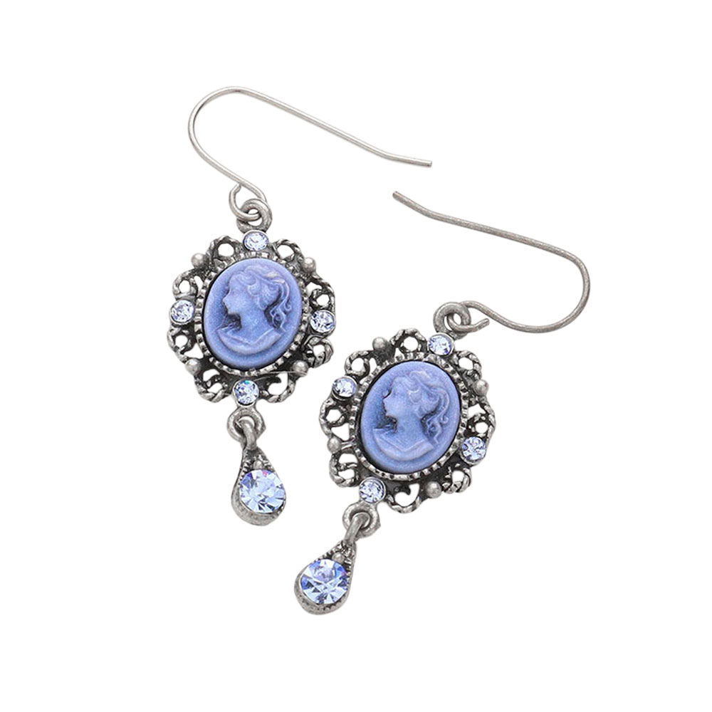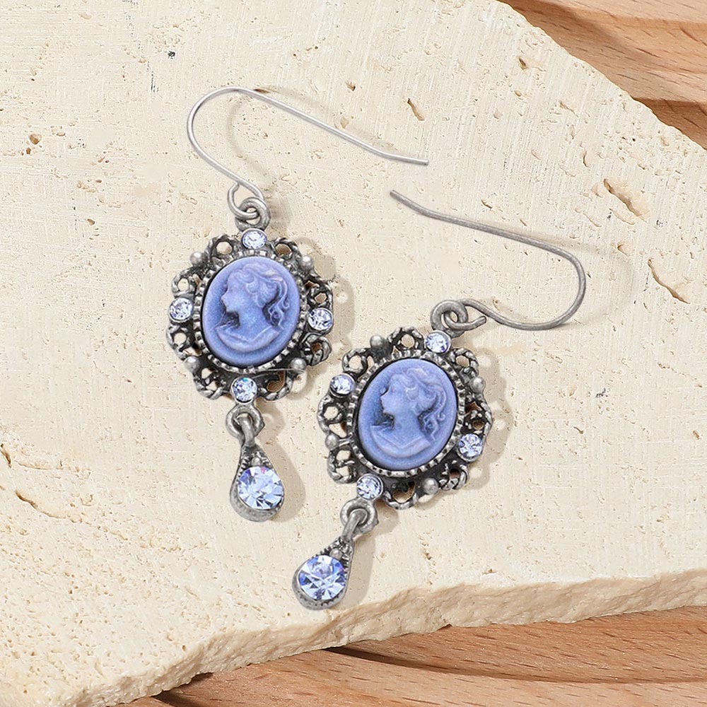 Details • Size : 0.6" X 1.6" • Fish Hook Back • Elegant vintage cameo drop earrings featuring detailed profile portraits framed with sparkling rhinestones and teardrop crystal charms. Perfect for adding a touch of timeless sophistication to both casual and formal outfits. • Made in USA • Lead and Nickel Compliant