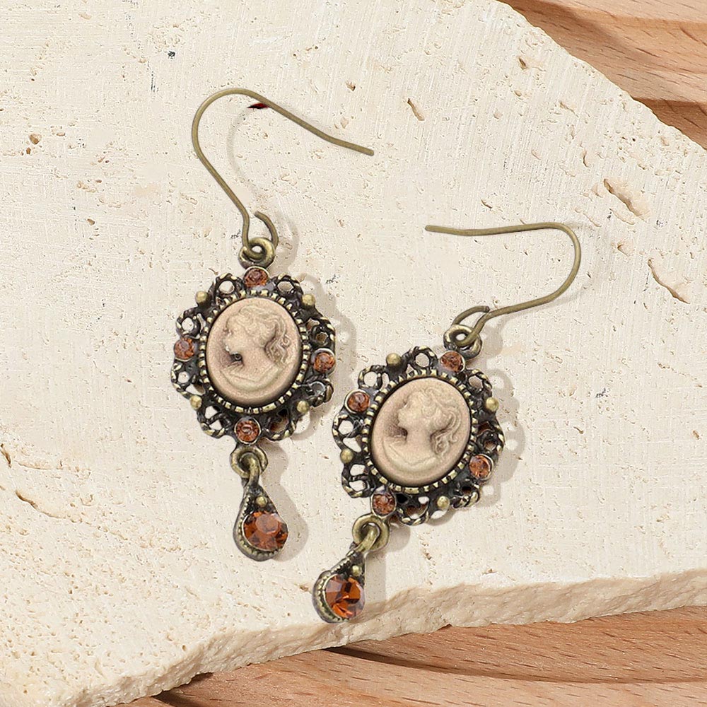 Details • Size : 0.6" X 1.6" • Fish Hook Back • Elegant vintage cameo drop earrings featuring detailed profile portraits framed with sparkling rhinestones and teardrop crystal charms. Perfect for adding a touch of timeless sophistication to both casual and formal outfits. • Made in USA • Lead and Nickel Compliant