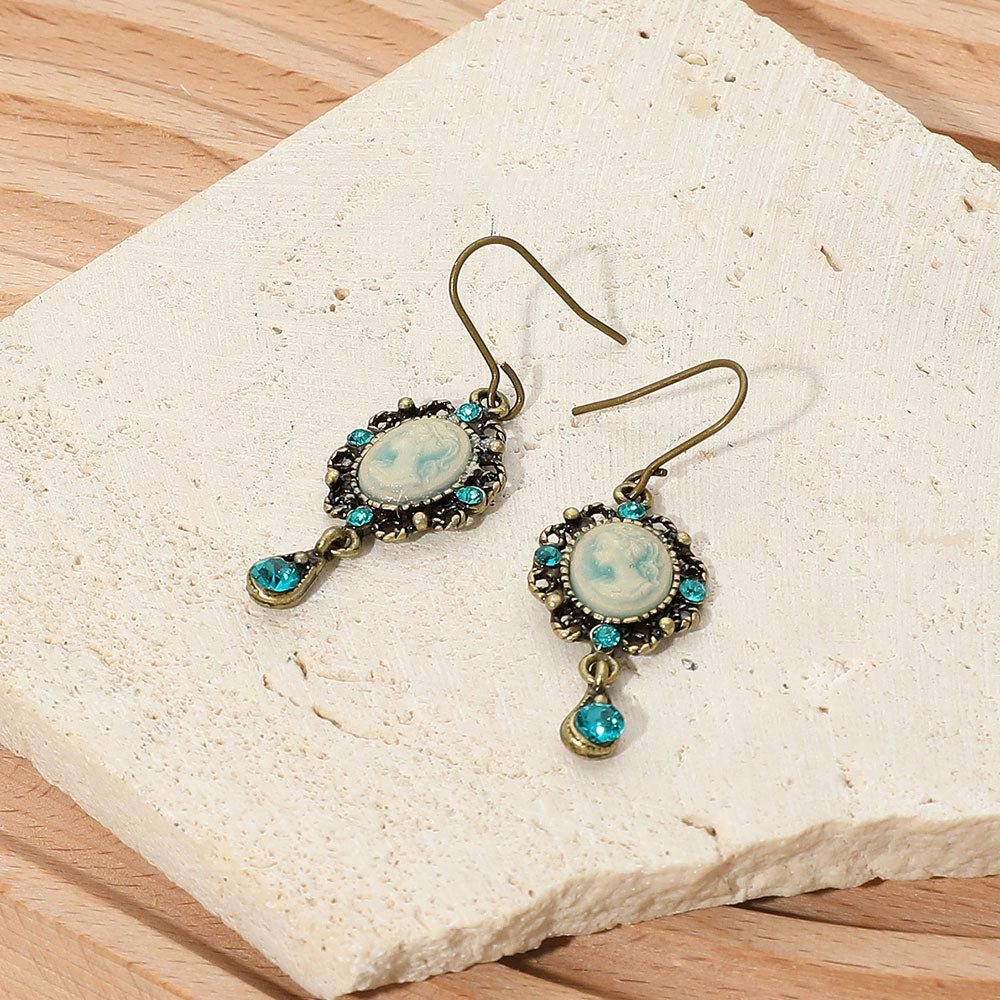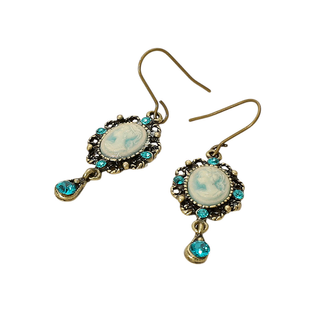 • Elegant vintage cameo drop earrings featuring detailed profile portraits framed with sparkling rhinestones and teardrop crystal charms. Perfect for adding a touch of timeless sophistication to both casual and formal outfits.