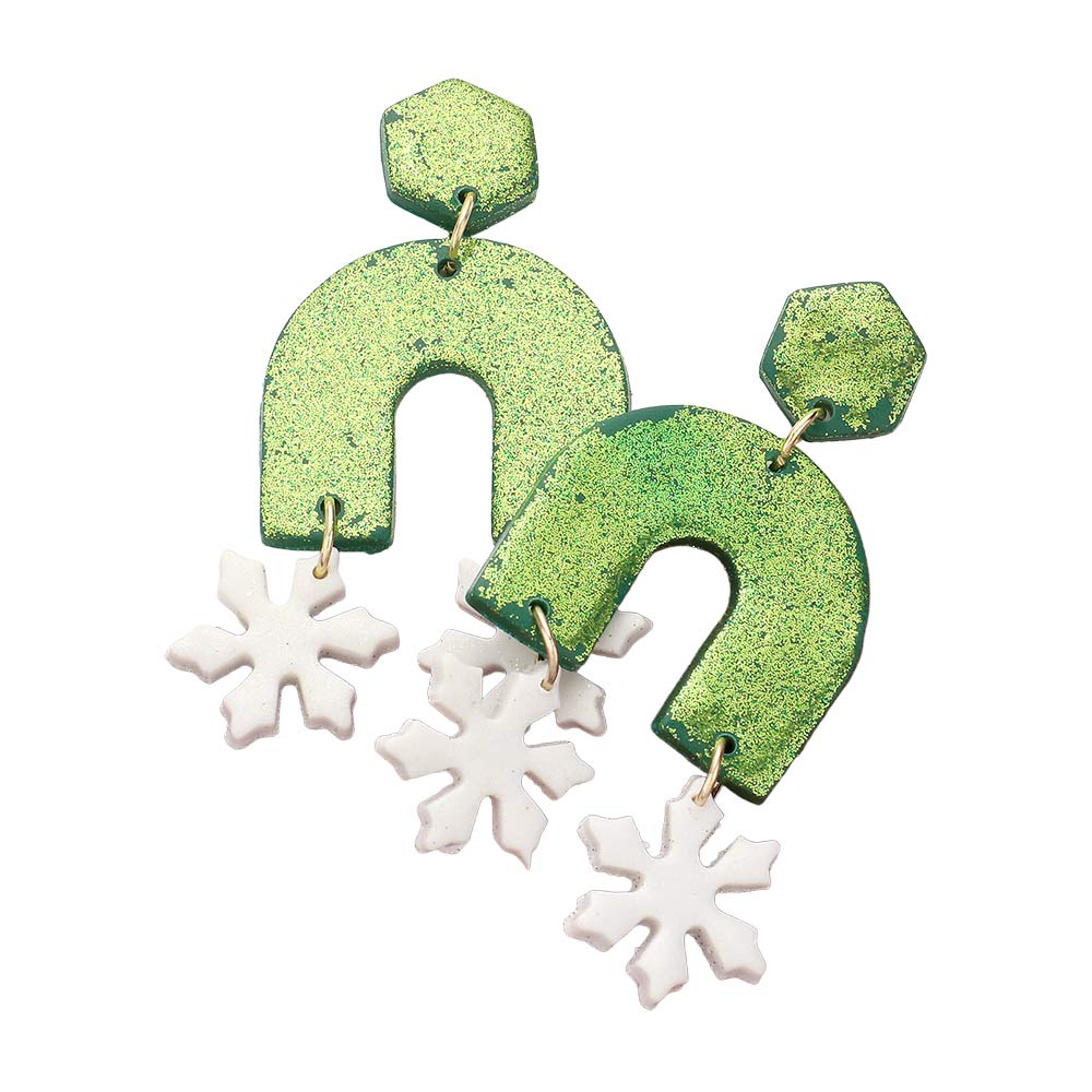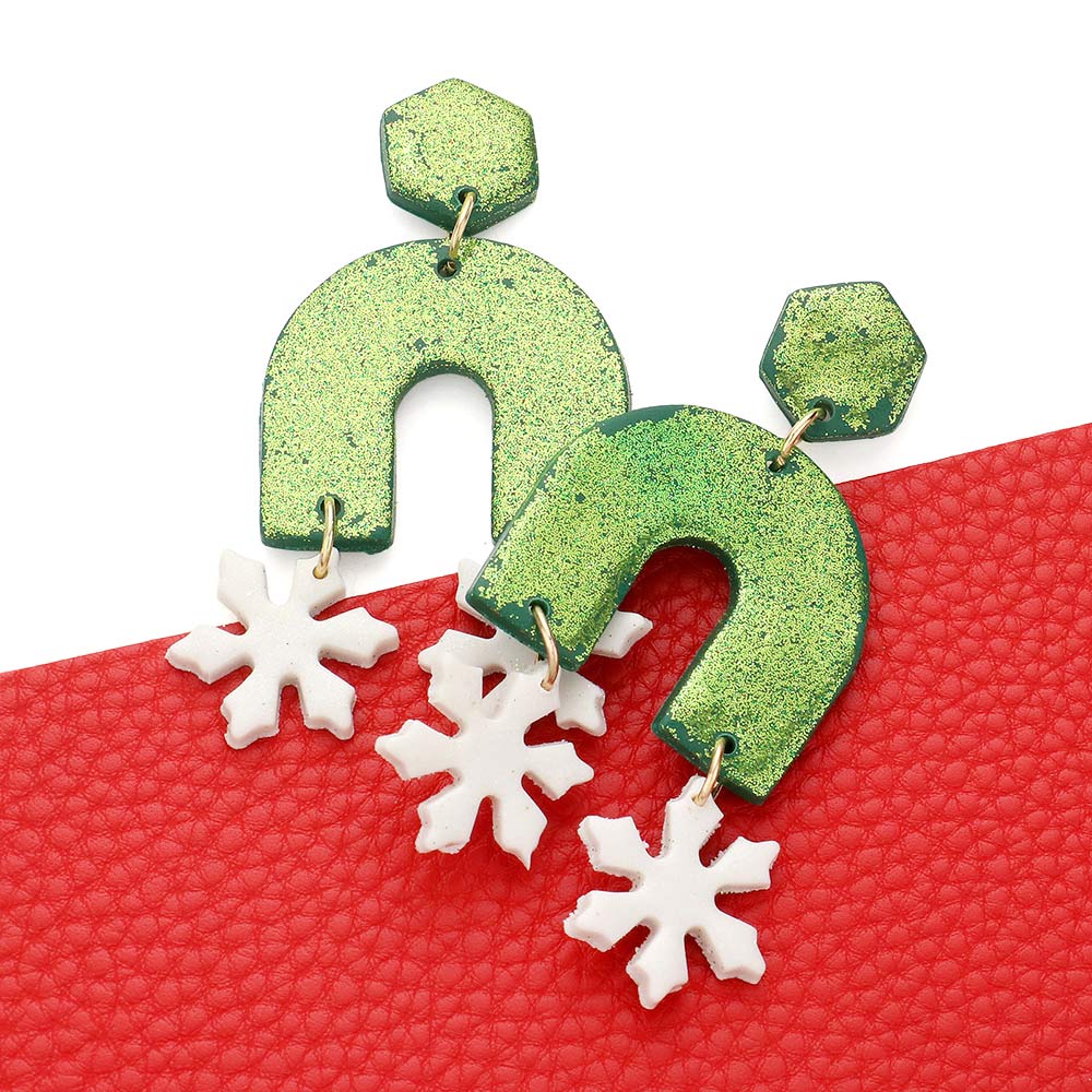 Double Snowflake Accented Glittered Polymer Clay Dangle Earrings