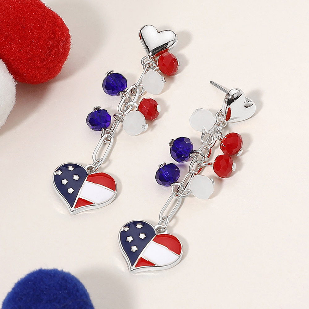 Enamel American USA Flag Heart Beaded Drop Chain Dangle Earrings