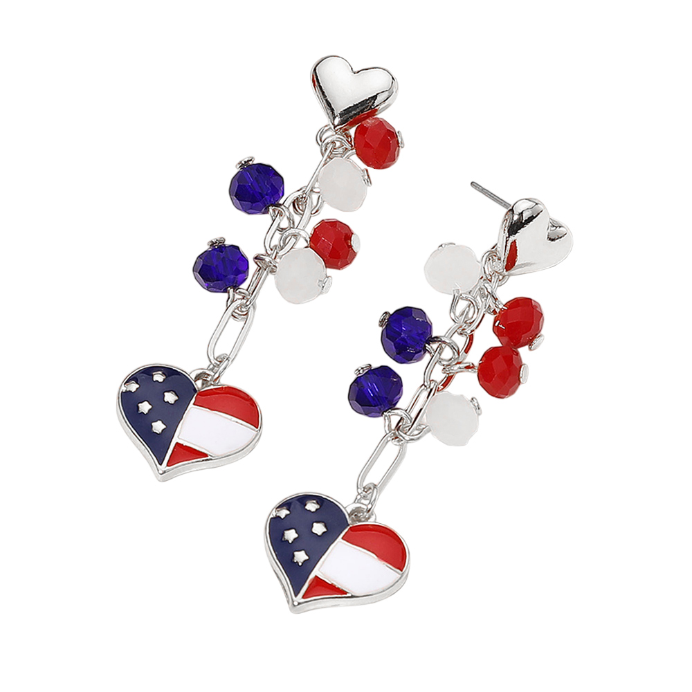 Details • Size : 0.6" X 2.3" • Post Back • Dangle heart earrings with faceted bead accents and star details. A bold, patriotic style perfect for festive events, parties, or spirited everyday wear. Lightweight and eye-catching. • Lead and Nickel Compliant