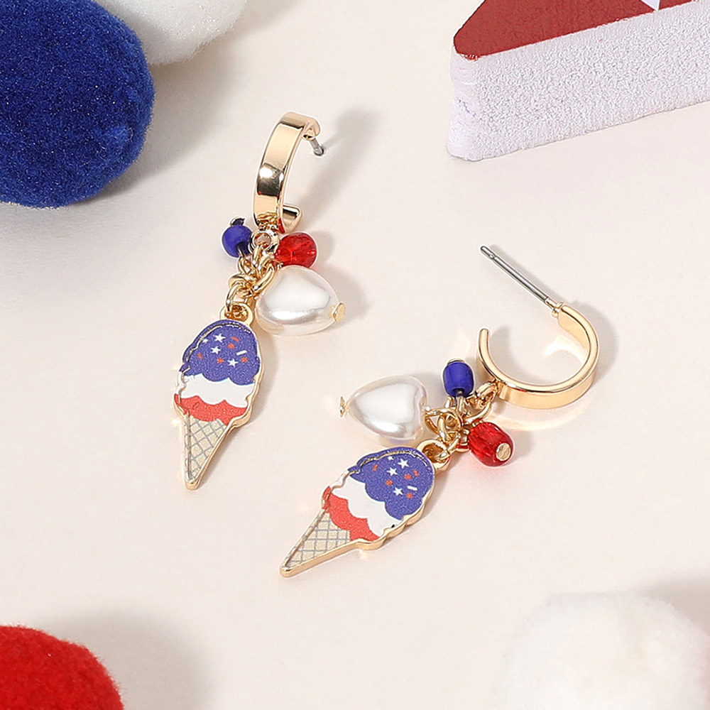 Enamel American USA Flag Ice Cream Cone Pearl Heart Beads Charm Dangle Earrings