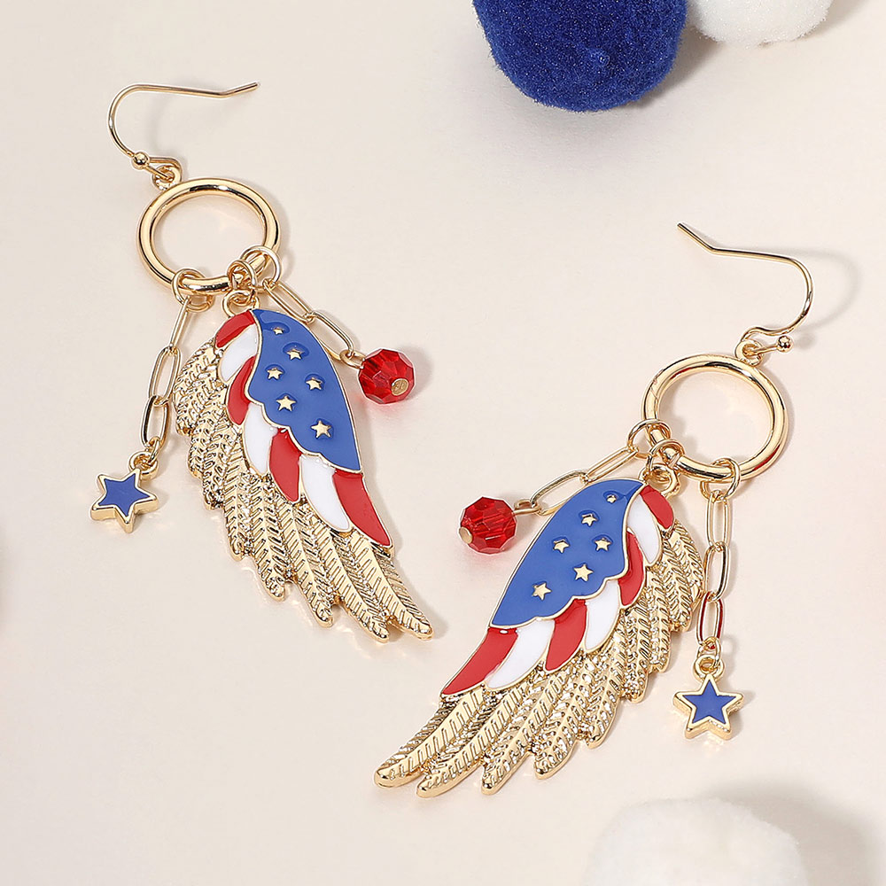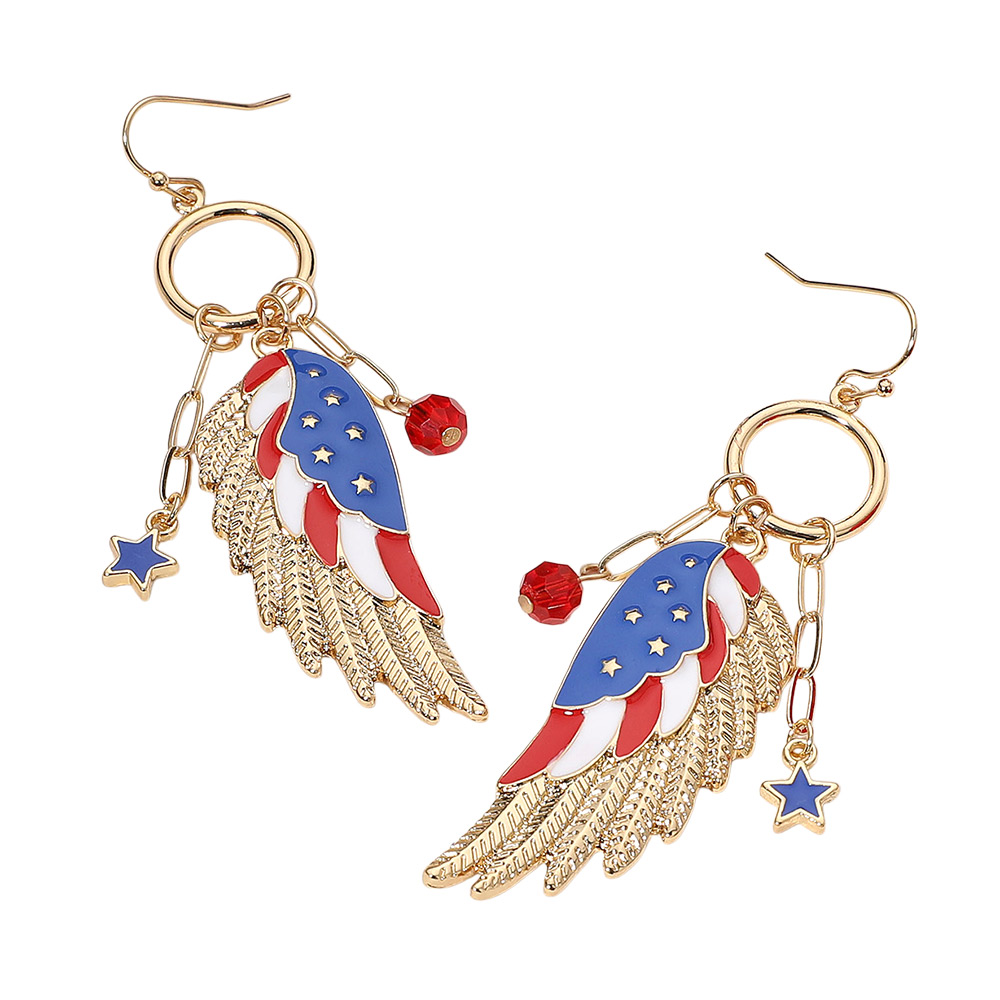 Details • Size : 0.6" X 2.5" • Fish Hook Back • Statement earrings with patriotic wing and star charms. A festive accessory perfect for celebrating holidays, events, or showing national pride with a bold and stylish look. • Lead and Nickel Compliant