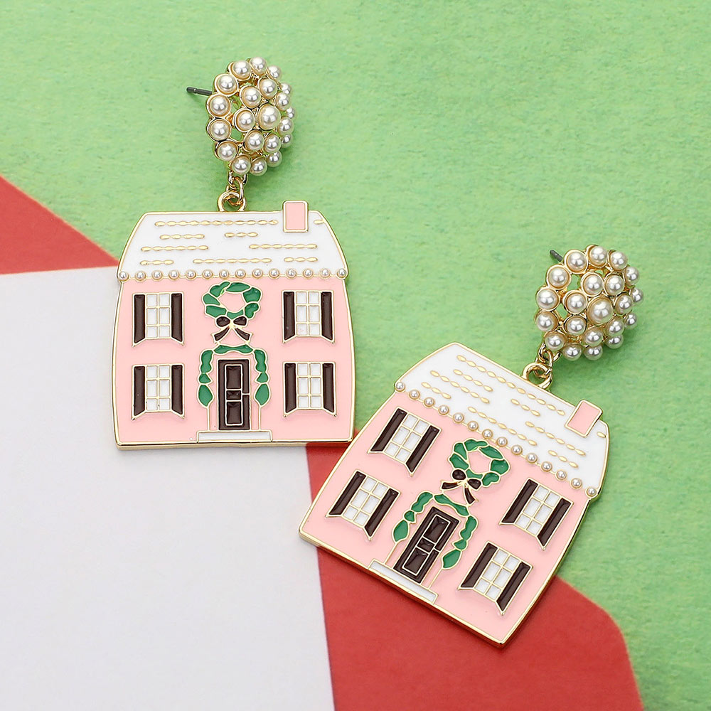 Details • Size : 1.2" X 2.25" • Post Back • Celebrate the season with charming house-themed drop earrings, detailed with pearl studs and festive accents. Ideal for holiday gatherings, these unique earrings add a whimsical touch to any outfit. • Lead and Nickel Compliant