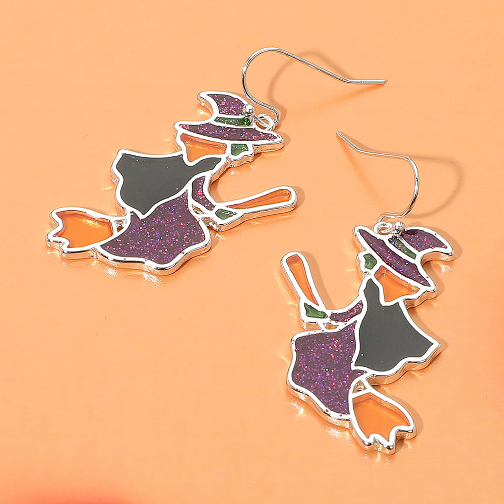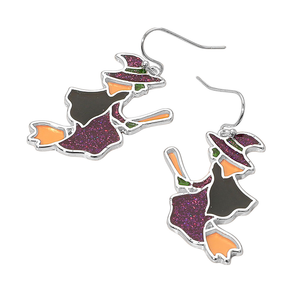 Details • Size : 1" X 1.8" • Fish Hook Back • Add a bewitching charm to your Halloween outfit with these flying witch earrings, featuring shimmering accents and whimsical design. Perfect for costume parties, trick-or-treating, or festive fun. • Lead and Nickel Compliant