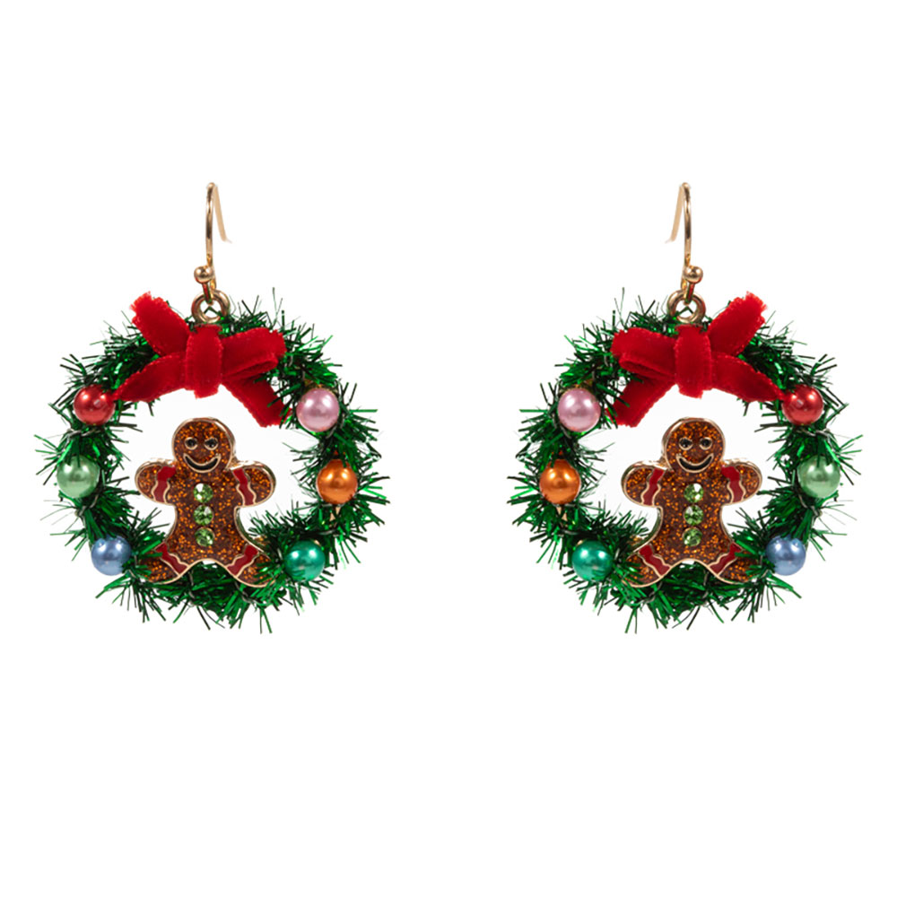 Details • Size : 1.25" X 1.5" • Brass Fish Hook Back • Add festive cheer to your look with these gingerbread wreath drop earrings, featuring playful details like bows and ornaments. A fun accessory for holiday parties, seasonal events, or as a unique stocking stuffer. • Lead and Nickel Compliant • Hypoallergenic