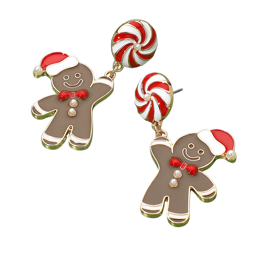 Details • Size : 1.25" X 2" • Post Back • Add a playful holiday touch with these charming gingerbread man earrings, featuring a cheerful design with candy-inspired details. Perfect for festive parties or seasonal gifting, they bring joyful character and sparkle to your Christmas style. • Lead and Nickel Compliant