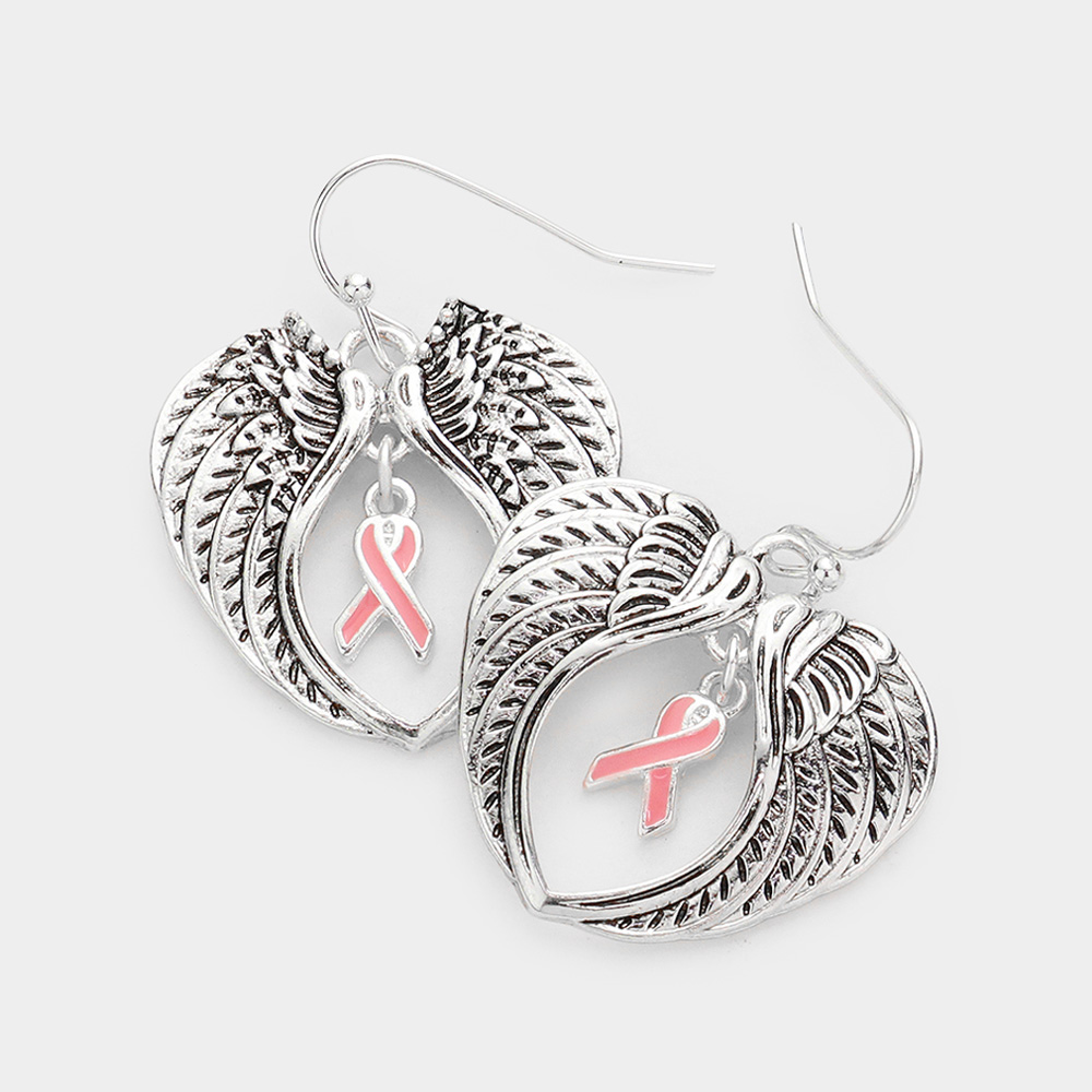 Enamel Pink Ribbon Pointed Angel Wings Dangle Earrings