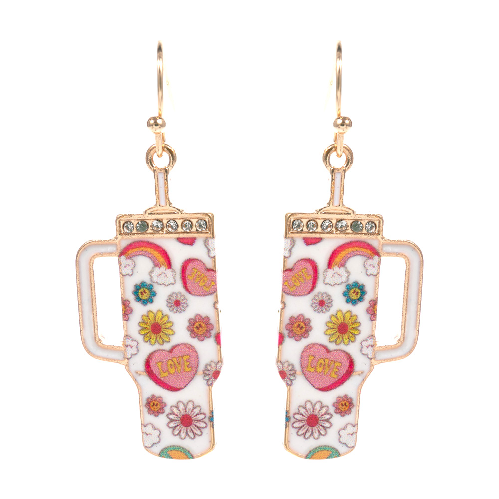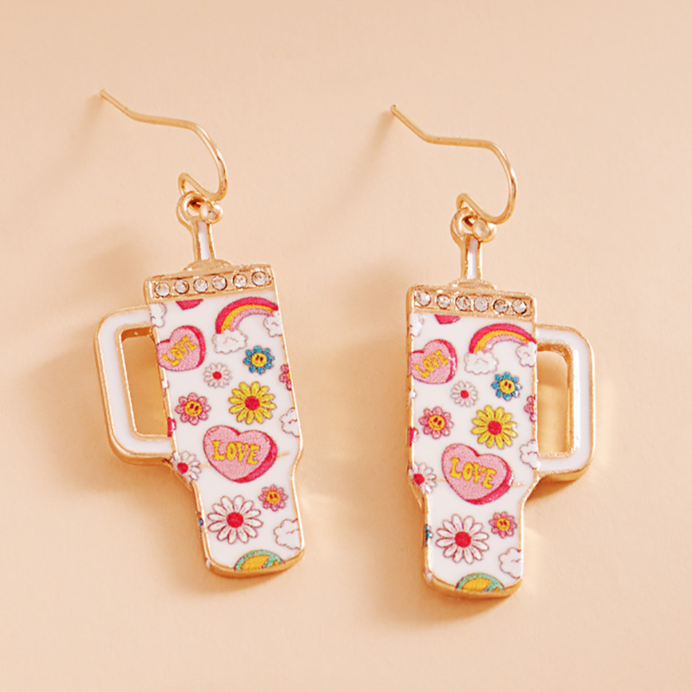 Details • Size : 0.6" X 1.6" • Fish Hook Back • Whimsical drop earrings shaped like mugs, decorated with playful love, peace, and rainbow motifs, finished with sparkling rhinestone details. A cheerful accessory that adds fun and positivity to any casual or festive look. • Lead and Nickel Compliant • Hypoallergenic