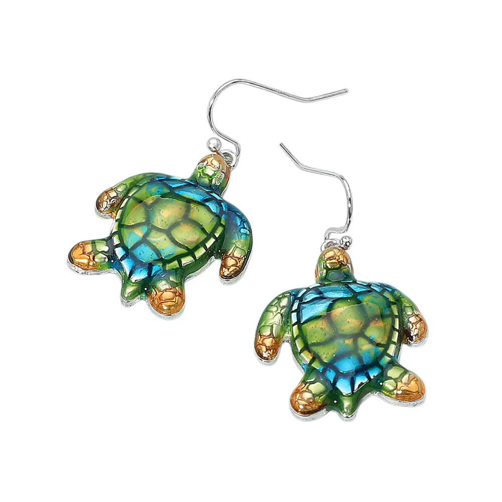 Details • Size : 0.9" X 1.5" • Fish Hook Back • Vibrant sea turtle dangle earrings with detailed shell pattern. A playful ocean-inspired accessory perfect for beach style, coastal vibes, and sea life fans. Lightweight and full of charm. • Lead and Nickel Compliant
