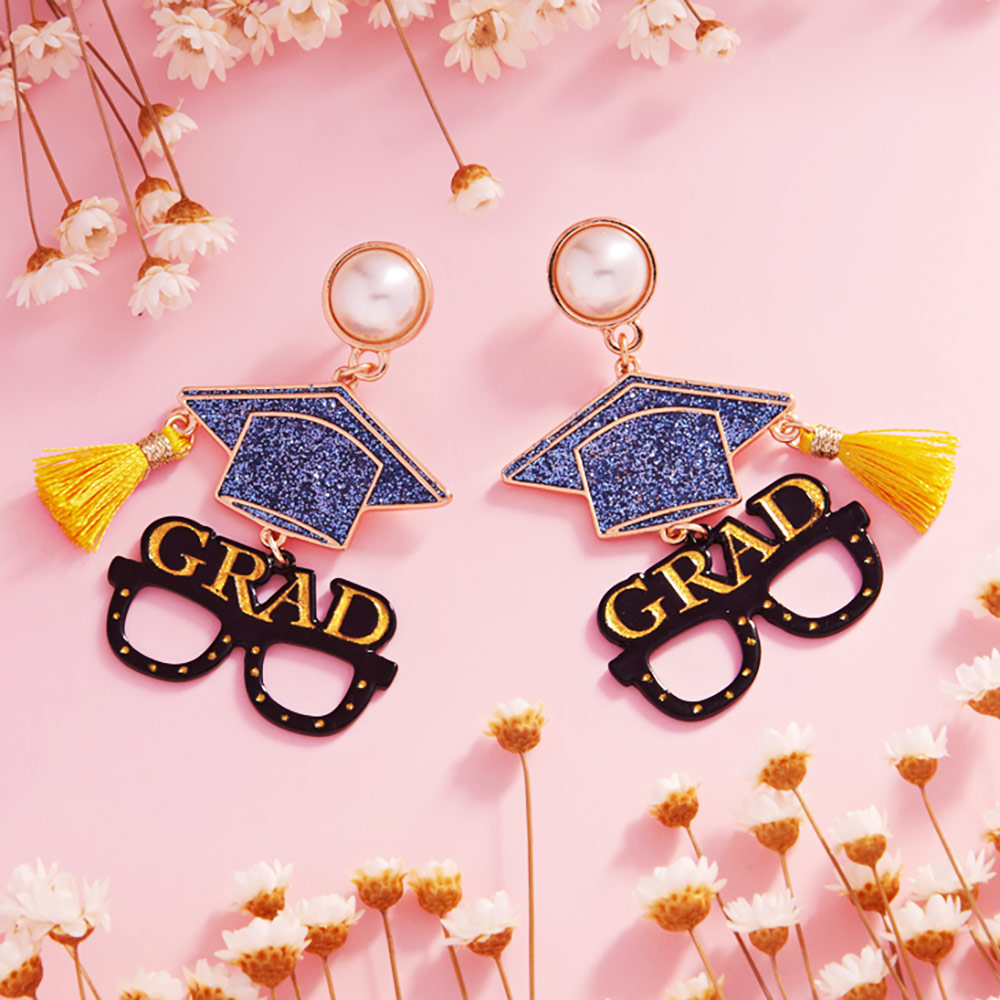Enamel Tassel Grad Hat Glasses Pearl Dangle Earrings