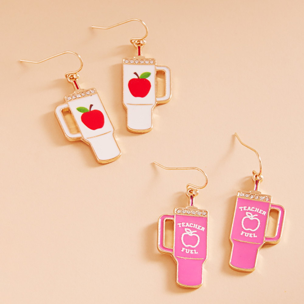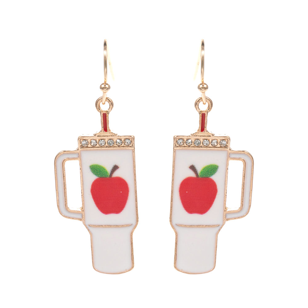 Details • Size : 0.6" X 1.6" • Fish Hook Back • Playful drop earrings shaped like mugs featuring a bold apple motif and rhinestone trim. A fun statement accessory ideal for teachers, apple lovers, or anyone who enjoys quirky and unique jewelry pieces. • Lead and Nickel Compliant • Hypoallergenic