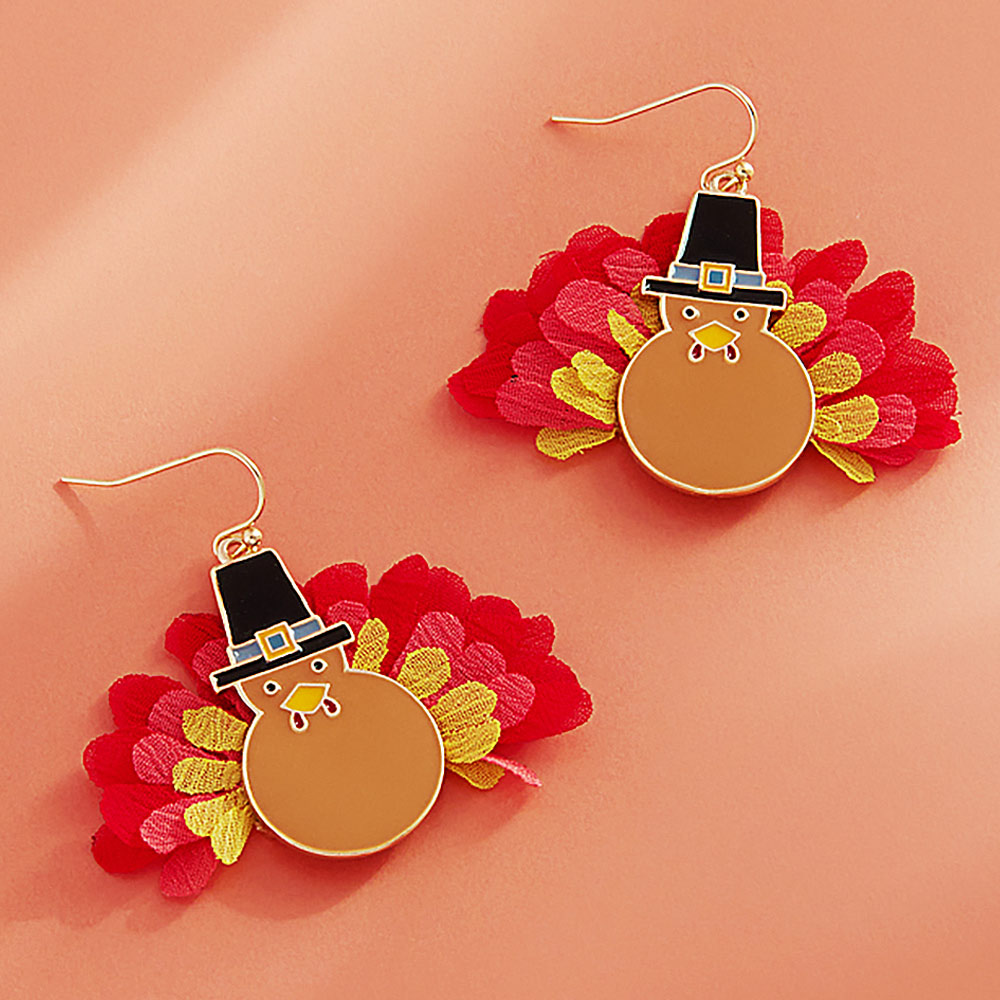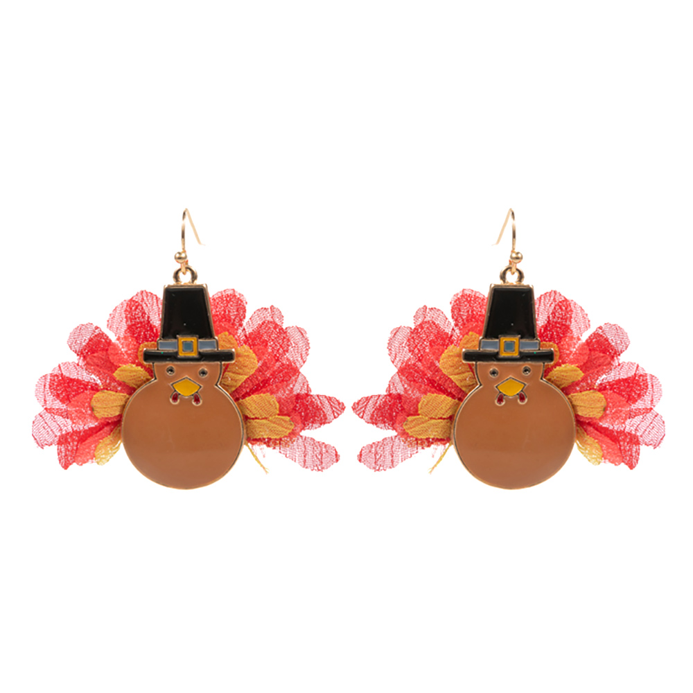 Details • Size : 1.75" X 1.75" • Brass Fish Hook Back • Add festive flair to your outfit with these Thanksgiving earrings featuring a charming turkey with layered feather details and a pilgrim hat. Ideal for holiday gatherings, themed events, or as a seasonal gift. • Lead and Nickel Compliant • Hypoallergenic