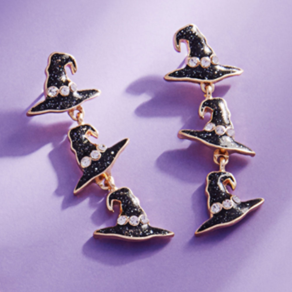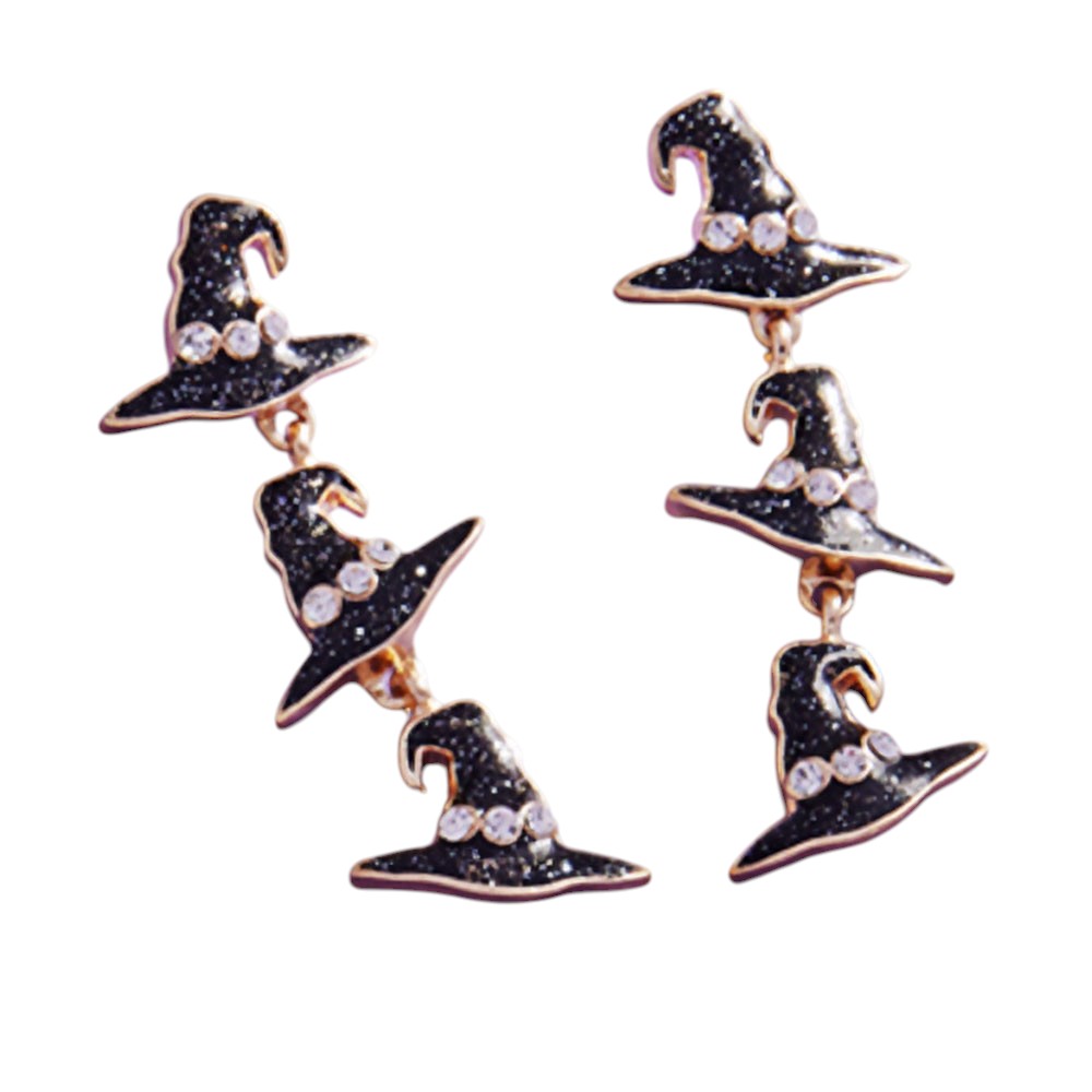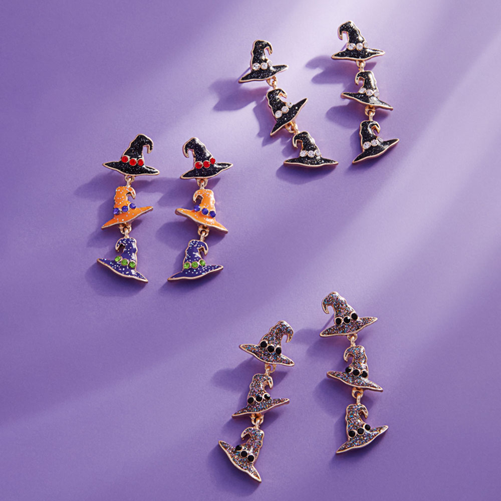 Details • Size : 0.75" X 2.25" • Titanium Post Back • Make a bold seasonal statement with these triple witch hat earrings, featuring a whimsical stack of glittering hats. Perfect for Halloween parties or themed outfits, they add fun, sparkle, and festive spirit to your look while showing off your love for playful accessories. • Lead and Nickel Compliant • Hypoallergenic