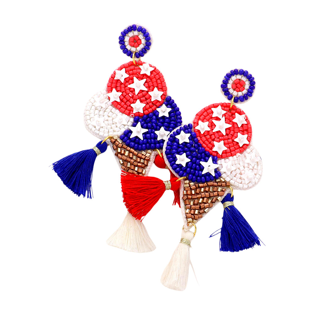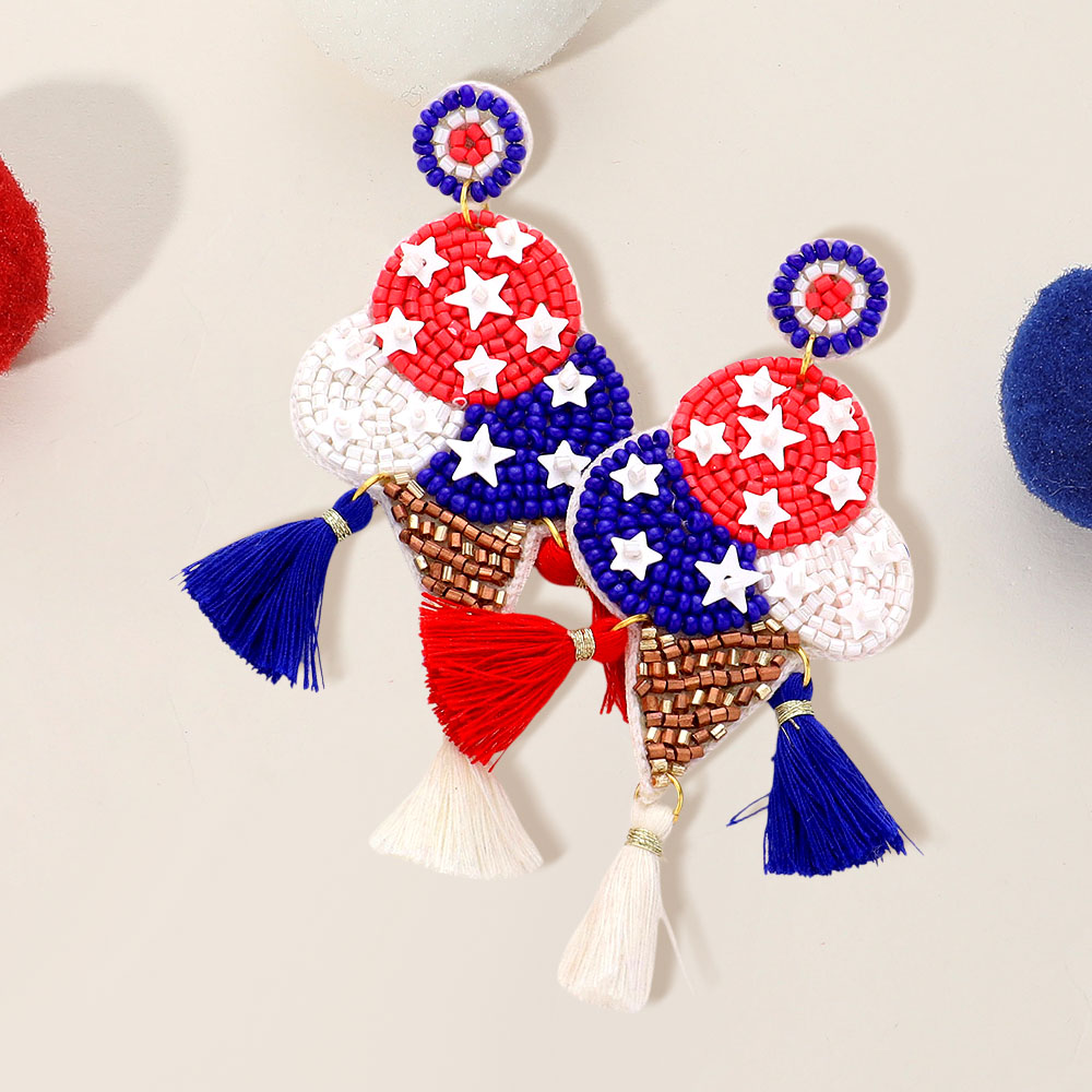 Fabric Back American USA Flag Seed Beaded Ice Cream Triple Tassel Link Dangle Earrings