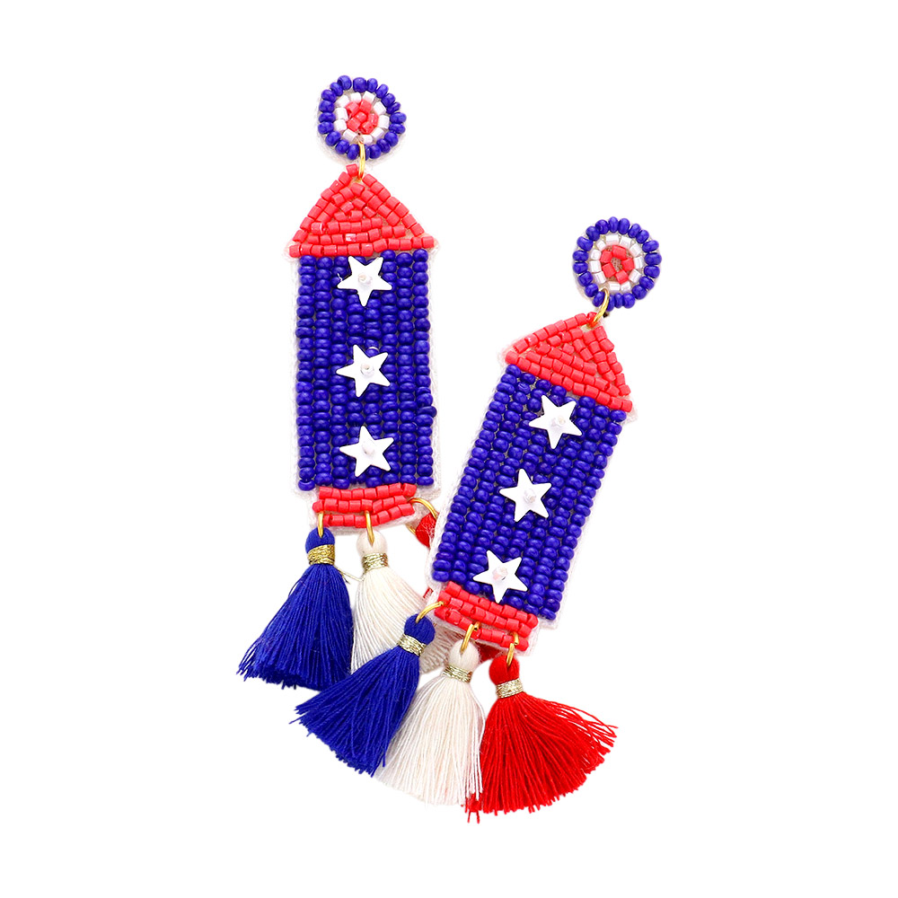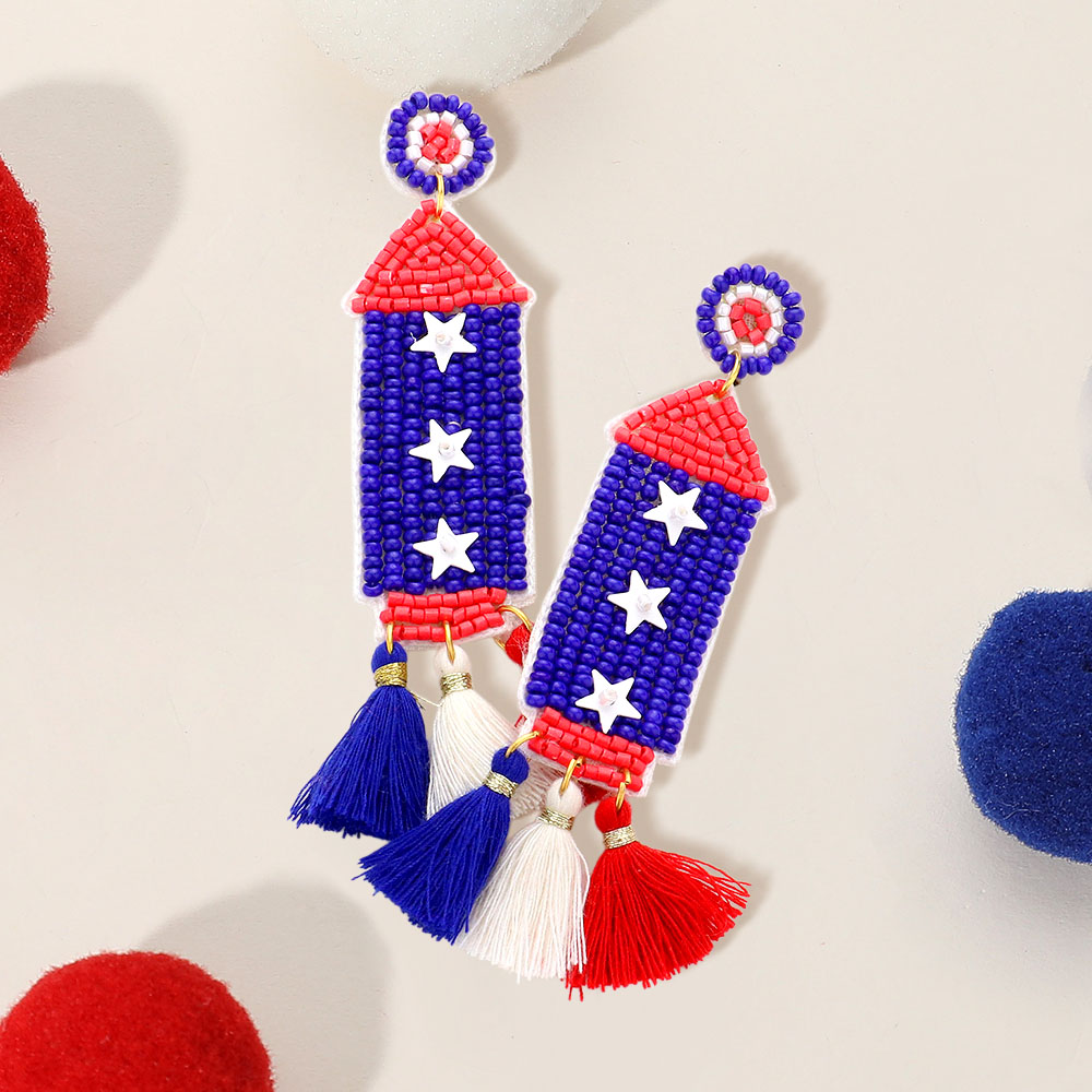 Fabric Back American USA Flag Seed Beaded Rocket Triple Tassel Link Dangle Earrings