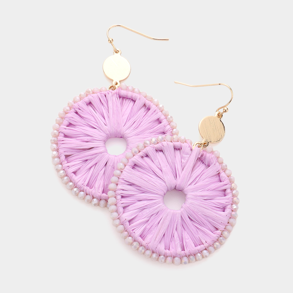 Faceted Bead Trimmed Woven Raffia Round Dangle Earrings