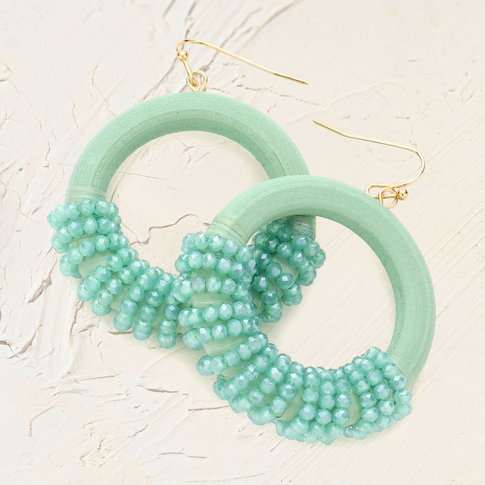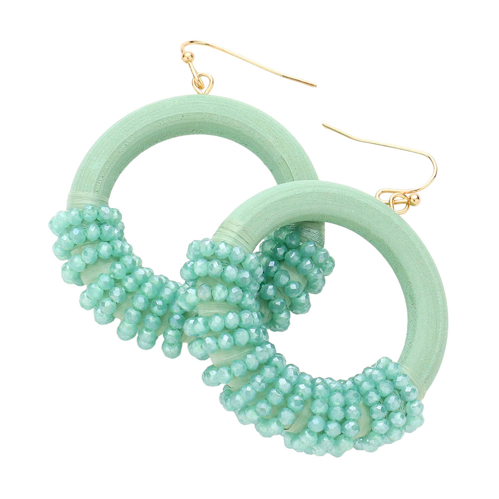 Faceted Bead Wrapped Open Wood Circle Dangle Earrings