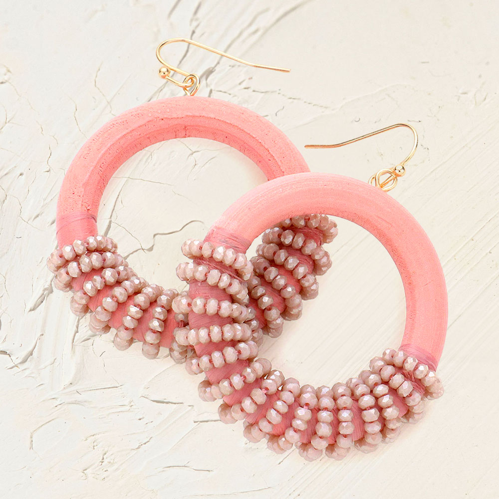Faceted Bead Wrapped Open Wood Circle Dangle Earrings
