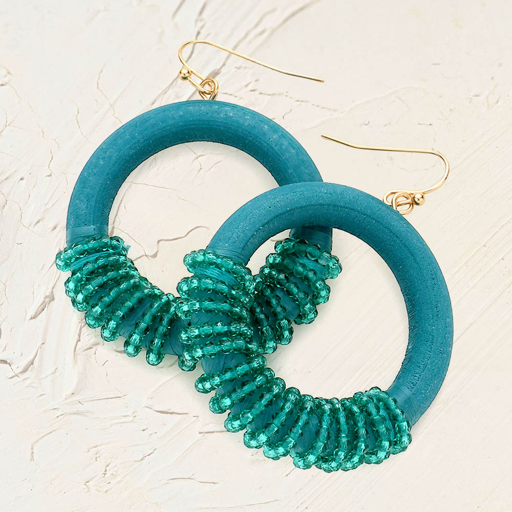 Faceted Bead Wrapped Open Wood Circle Dangle Earrings