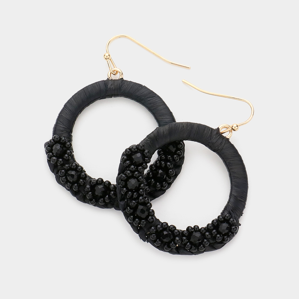 Faceted Beaded Flower Raffia Wrapped Circle Dangle Earrings