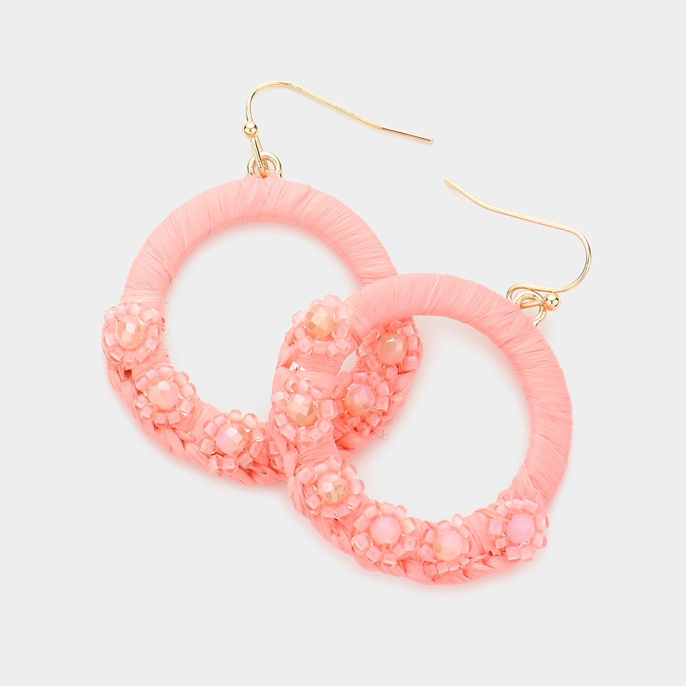 Faceted Beaded Flower Raffia Wrapped Circle Dangle Earrings