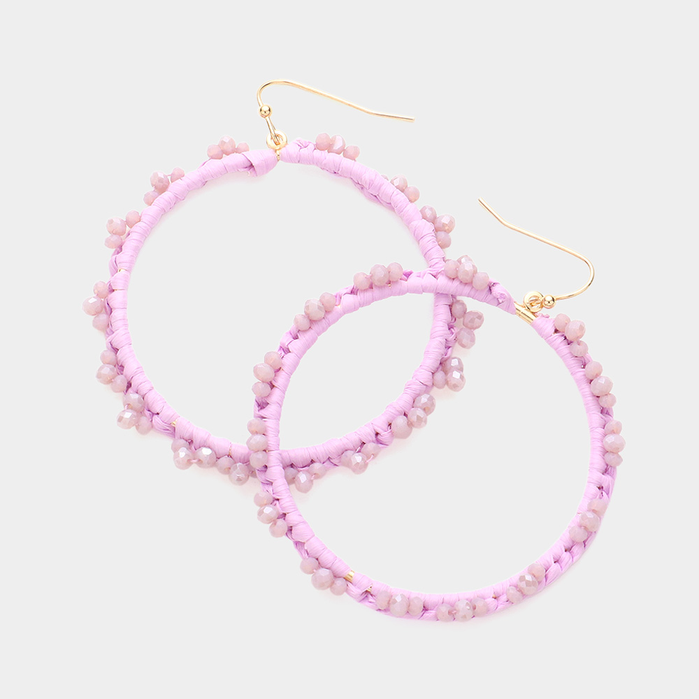 Faceted Beaded Pointed Raffia Wrapped Open Circle Dangle Earrings