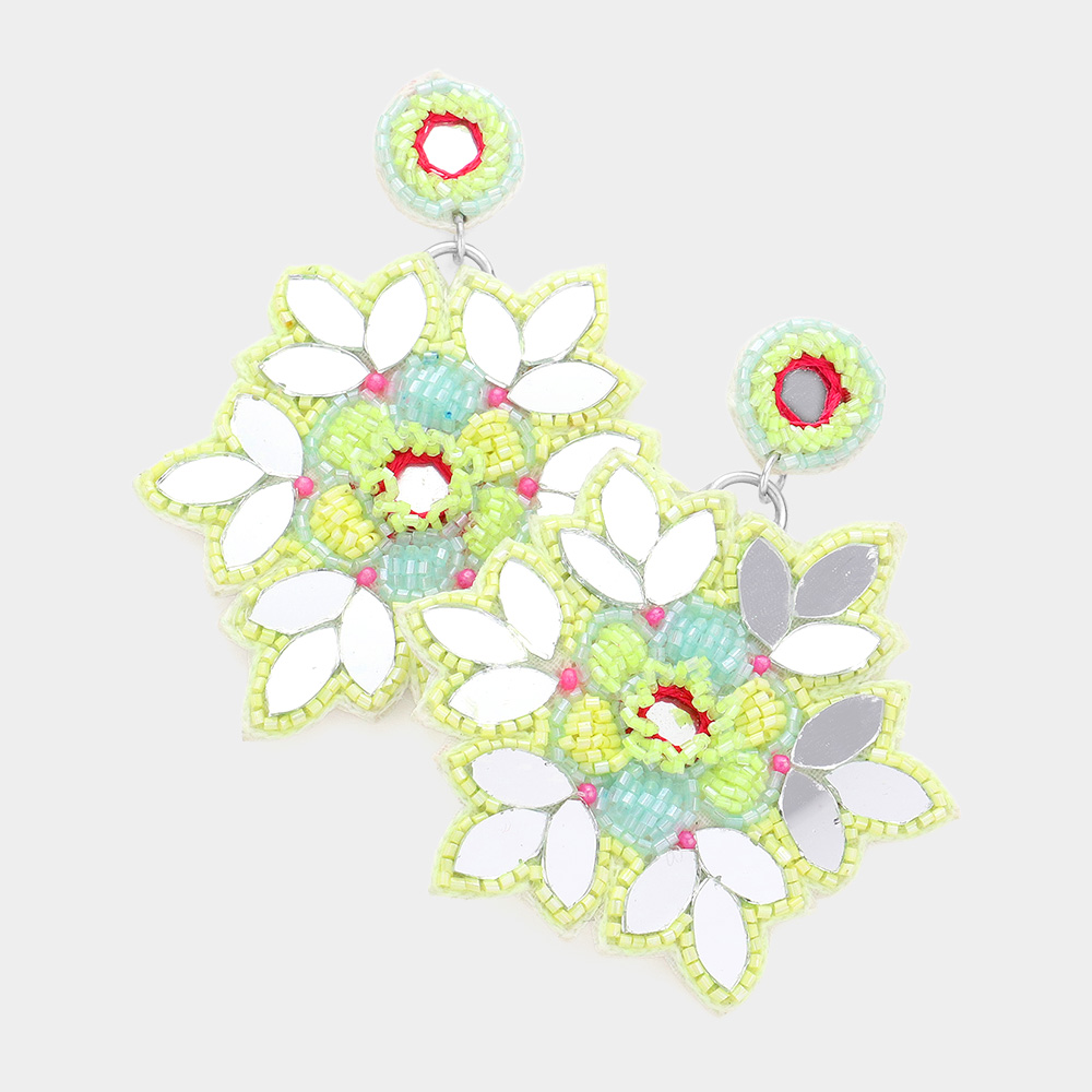 Faux Leather Back Mirror Beaded Floral Dangle Earrings
