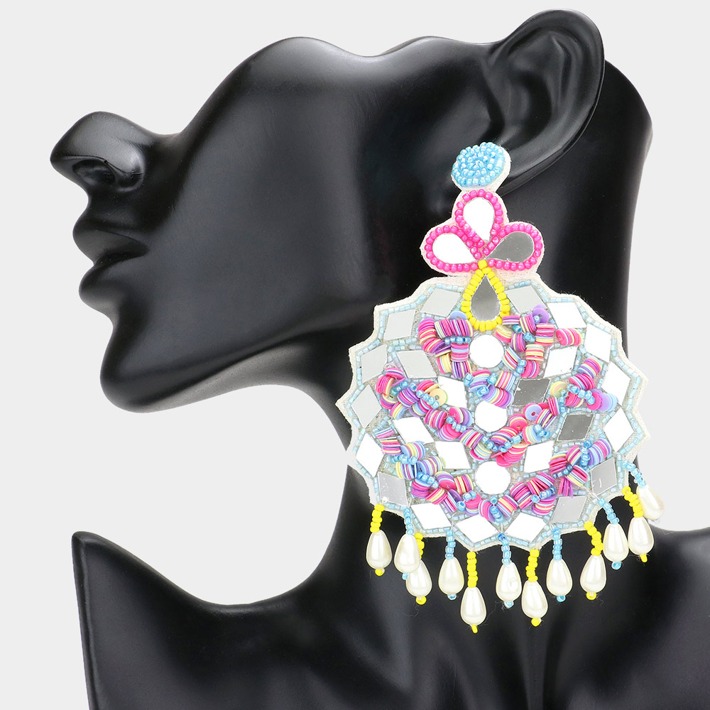 Faux Leather Back Mirror Boho Sequin Seed Beaded Dangle Earrings