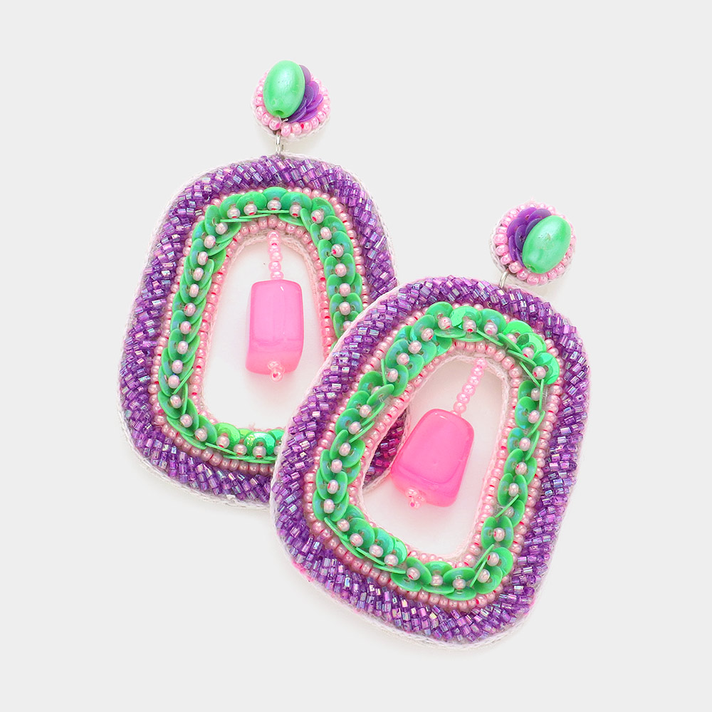 Faux Leather Back Sequin Beaded Irregular Rectangle Dangle Earrings