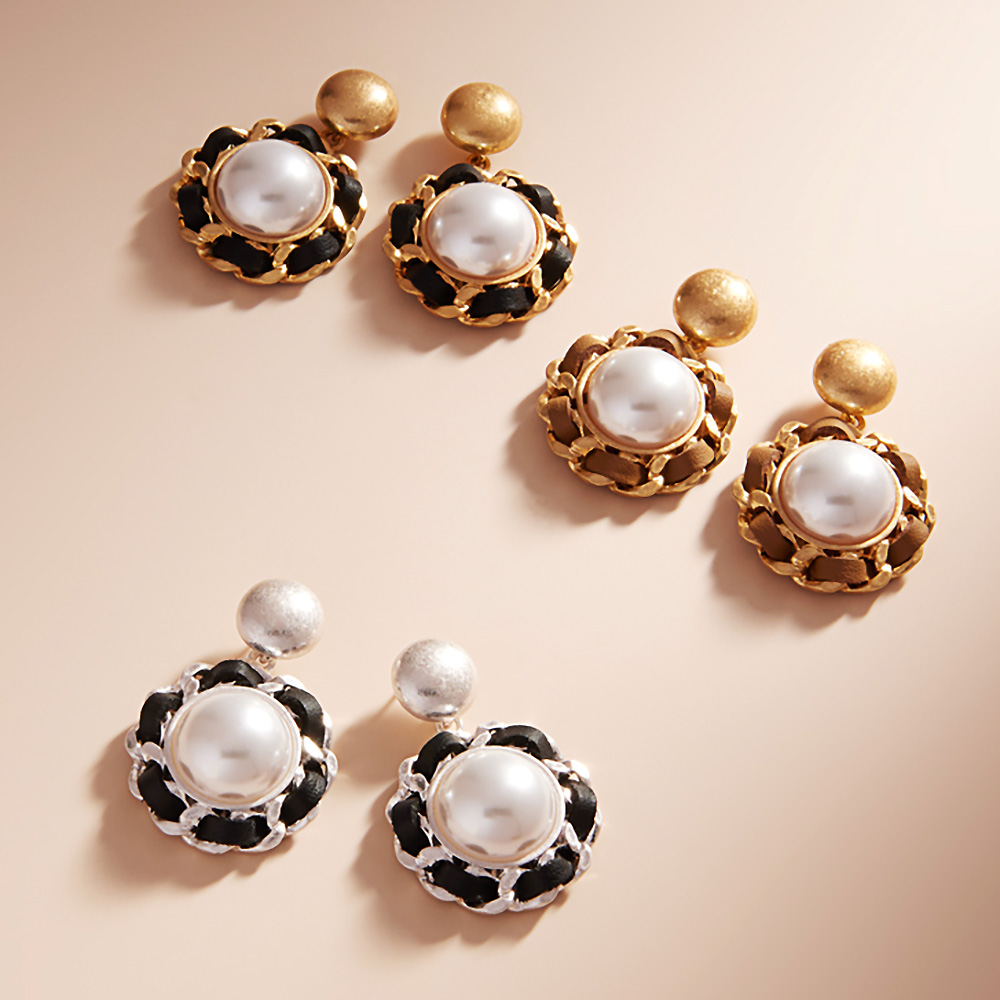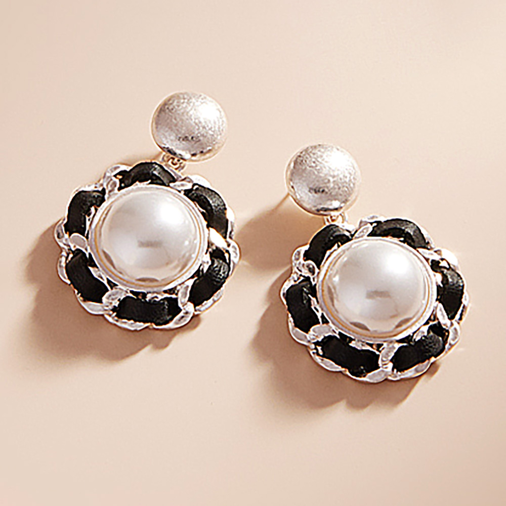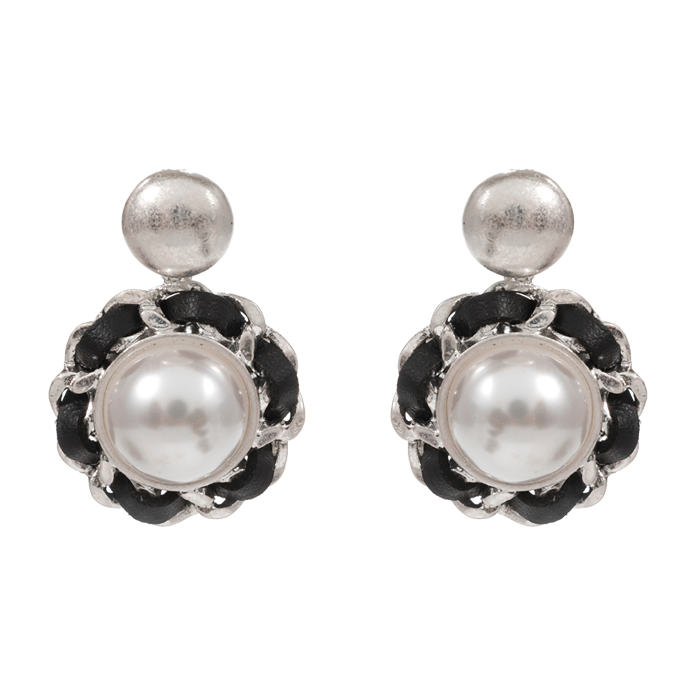 Faux Leather Braided Vintage Metal Chain Round Pearl Dangle Earrings