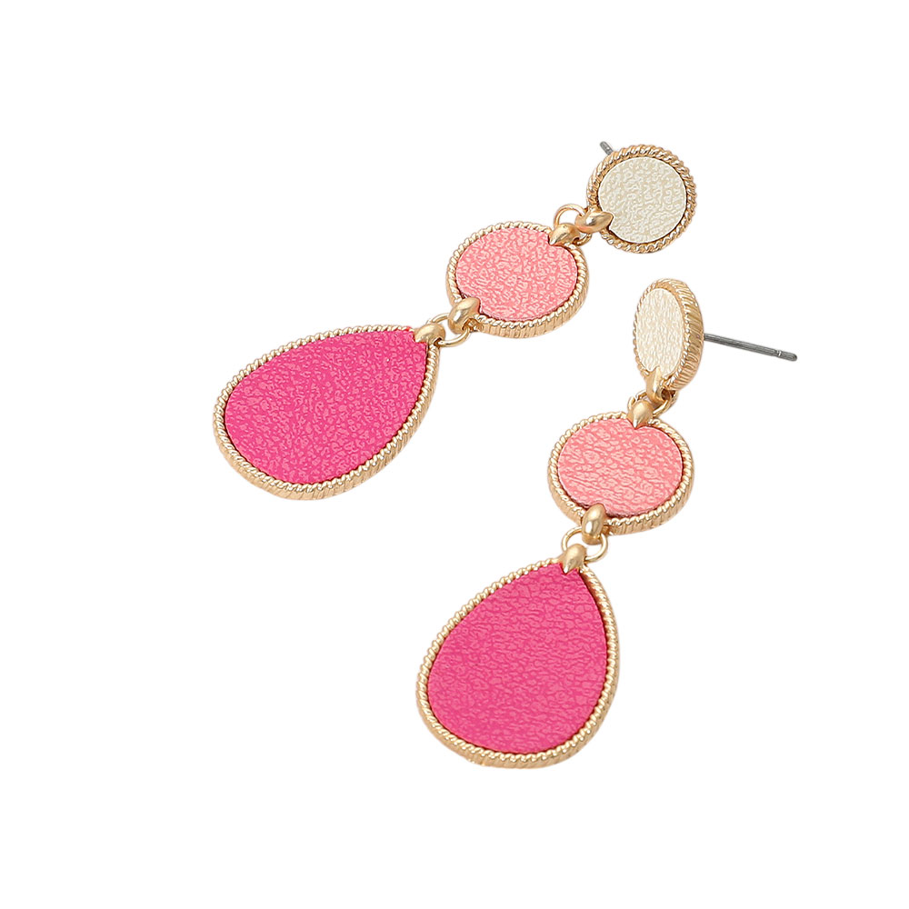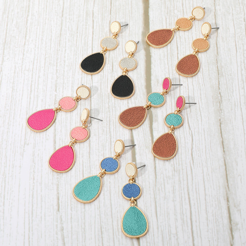 Details • Size : 0.75" X 2.2" • Post Back • Trendy teardrop dangle earrings with dual faux leather drops in bold and neutral tones. Lightweight and versatile, perfect for casual outfits, parties, or making a stylish everyday statement. • Lead and Nickel Compliant