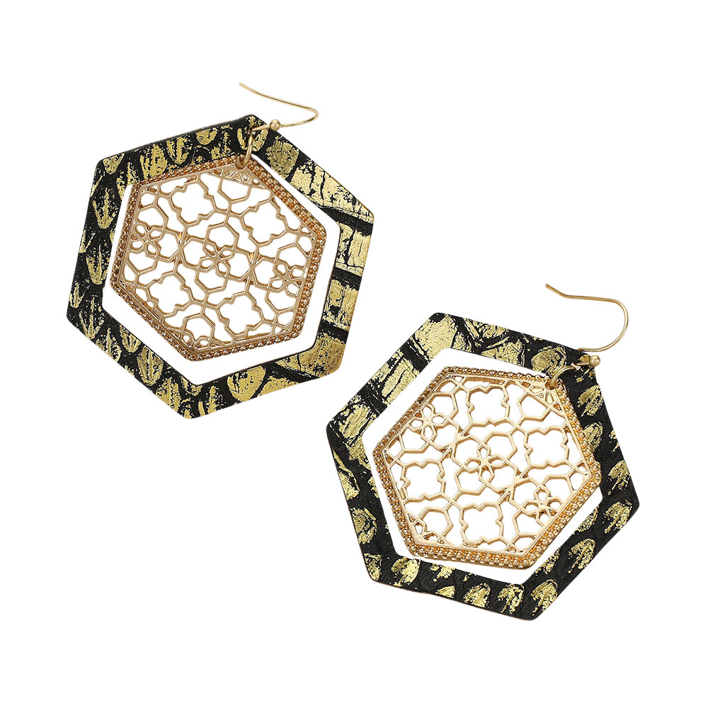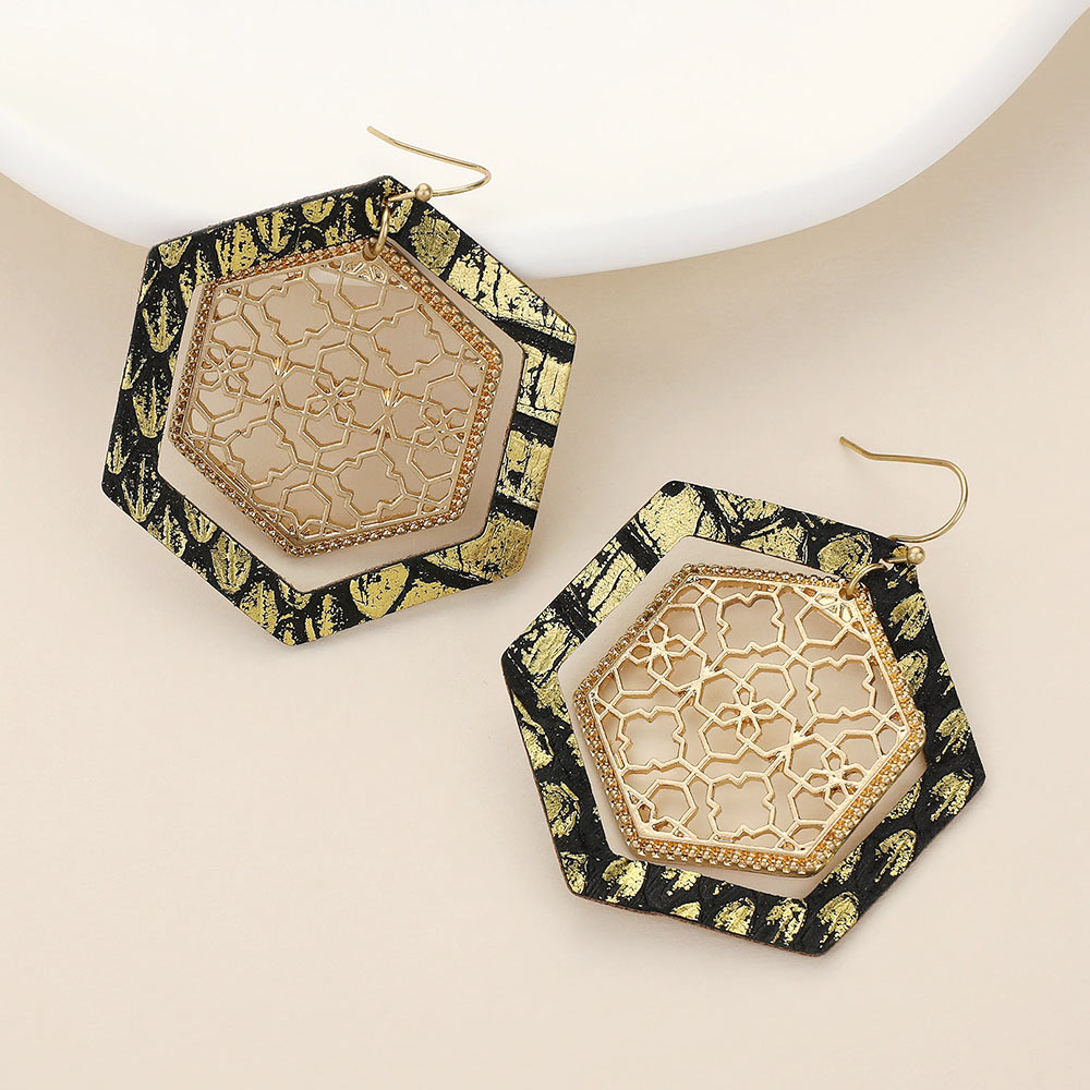• Elevate your style with these hexagon drop earrings featuring a bold layered frame and delicate lace-inspired inner detail. Lightweight and versatile, they add modern elegance to both casual outfits and evening looks.