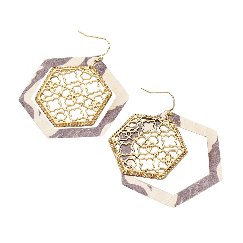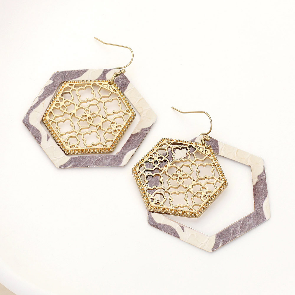 • Elevate your style with these hexagon drop earrings featuring a bold layered frame and delicate lace-inspired inner detail. Lightweight and versatile, they add modern elegance to both casual outfits and evening looks.