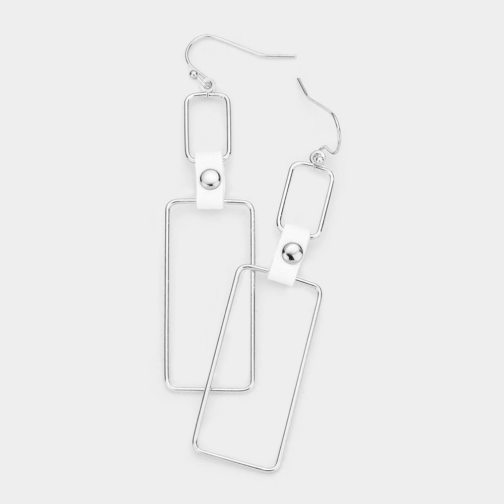 Faux Leather Tip Textured Open Metal Double Rectangle Earrings