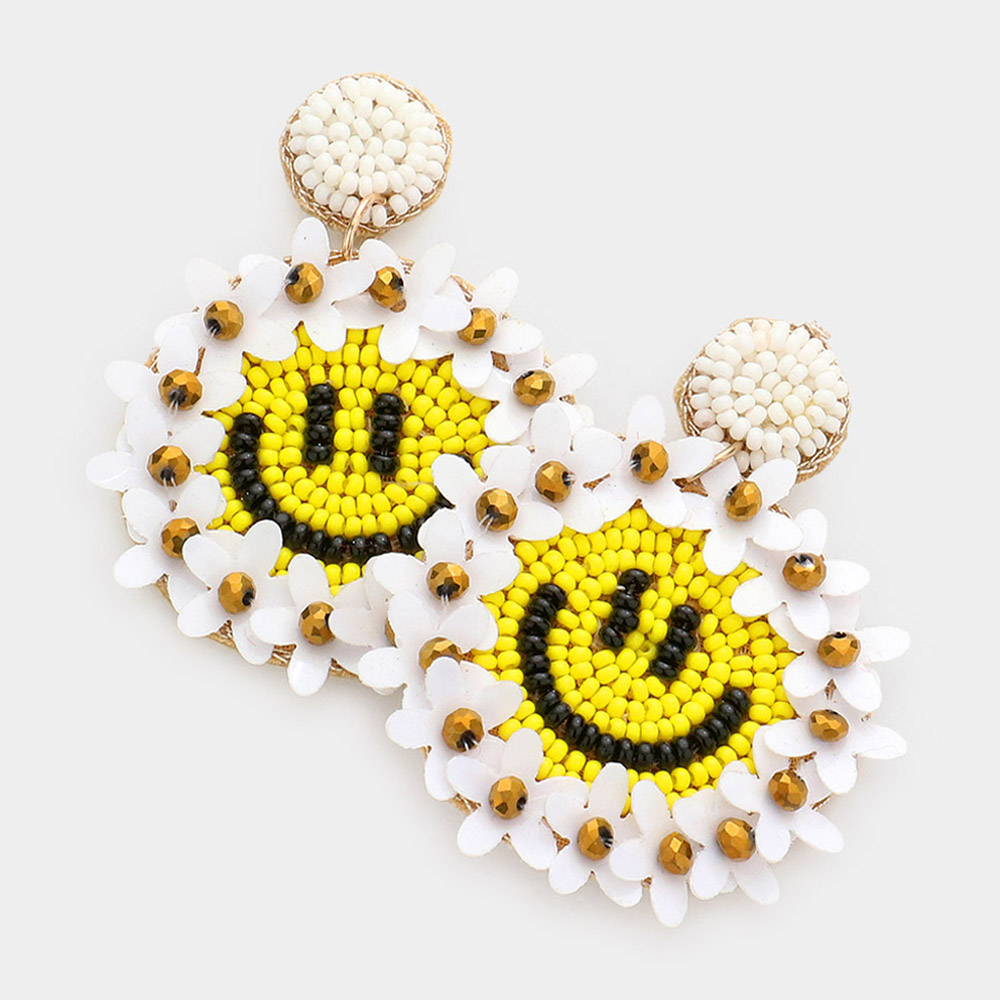 Felt Back Floral Seed Beaded Smile Dangle Earrings