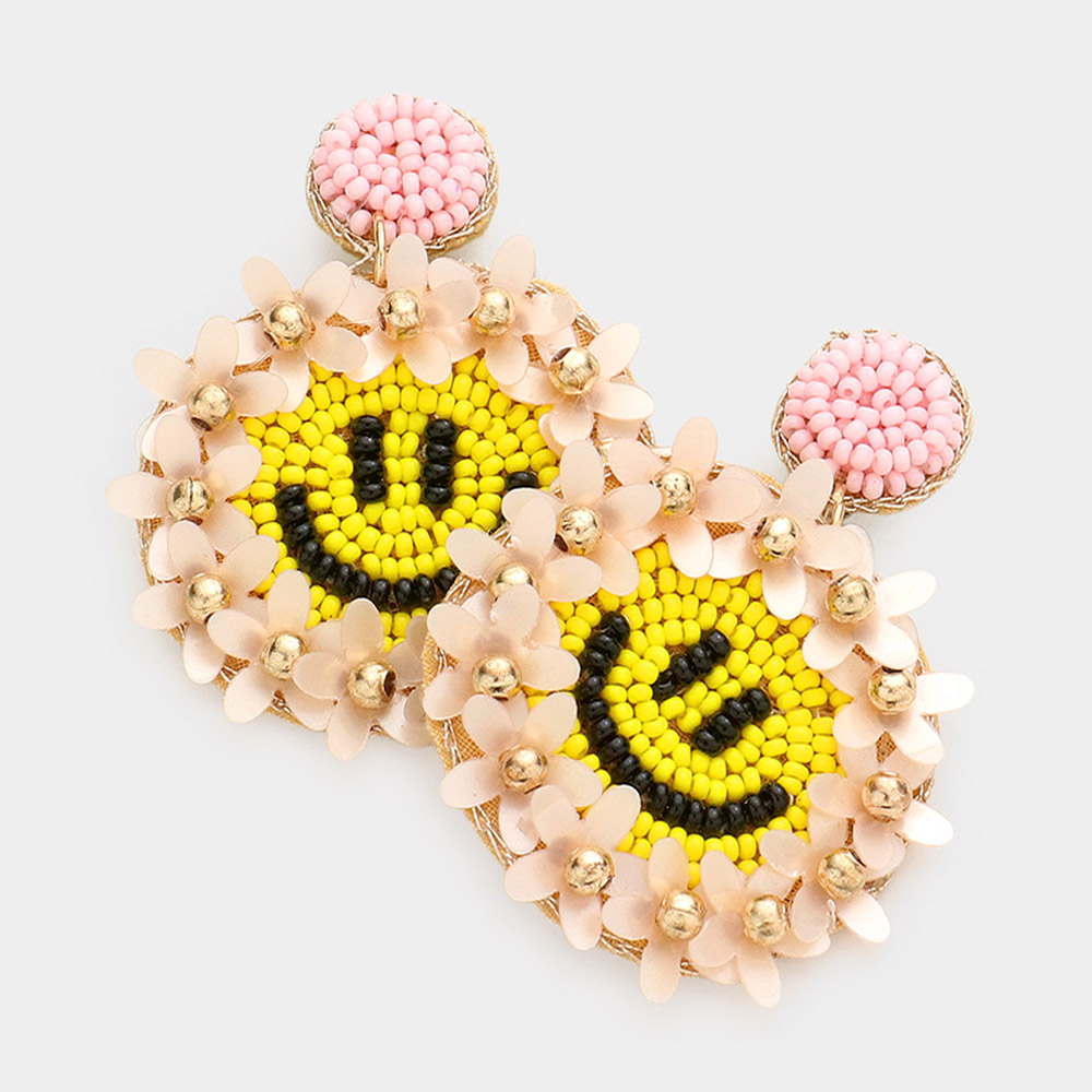 Felt Back Floral Seed Beaded Smile Dangle Earrings