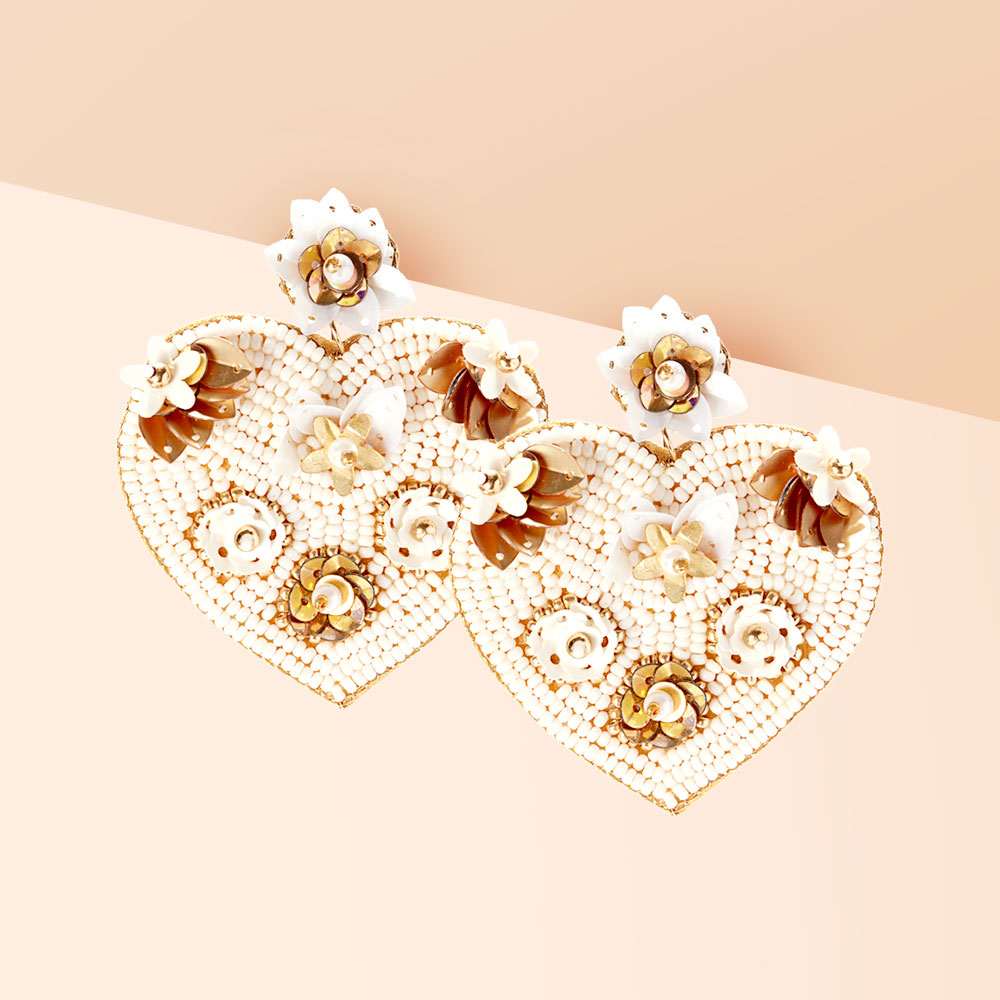 Felt Back Flower Pointed Seed Beaded Heart Dangle Earrings