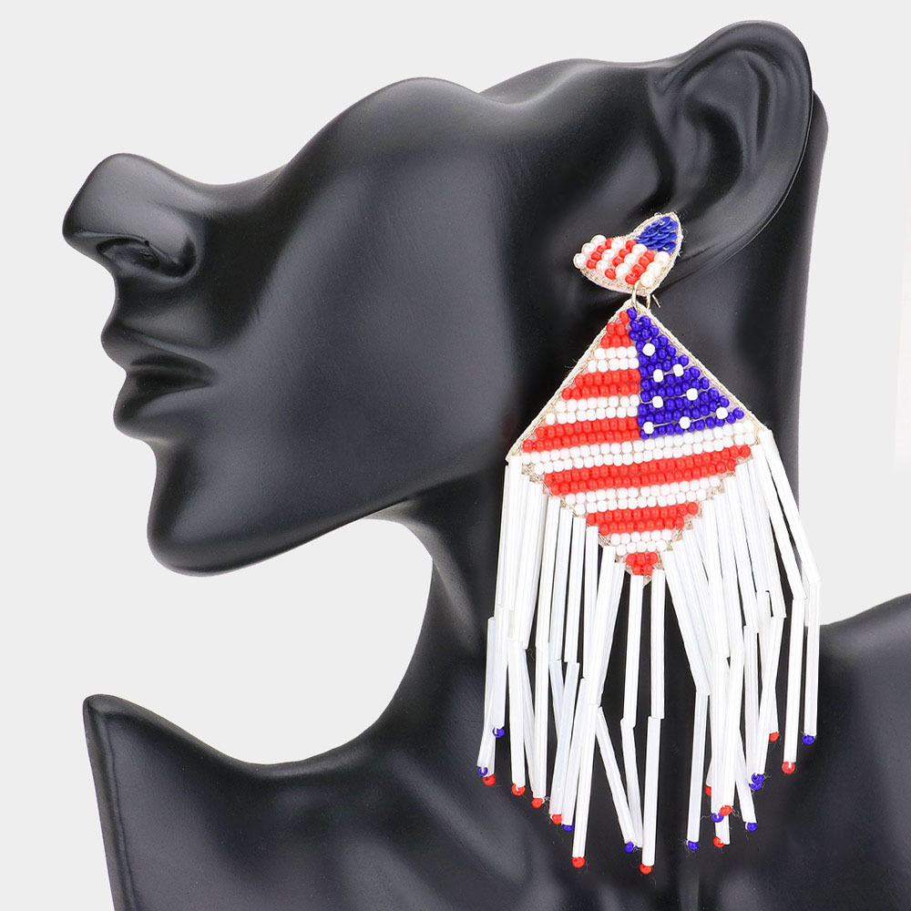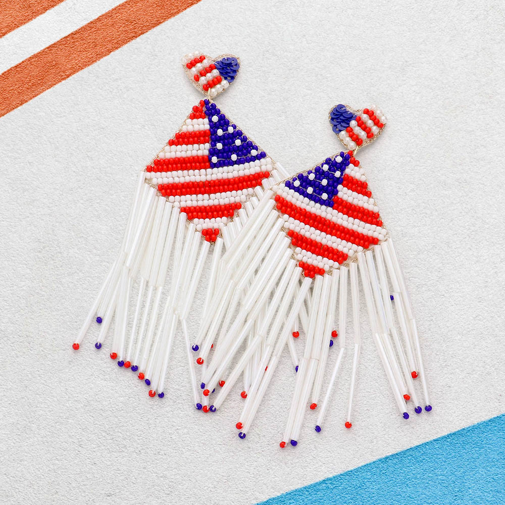 Felt Back Heart American USA Flag Bead Fringe Dangle Earrings