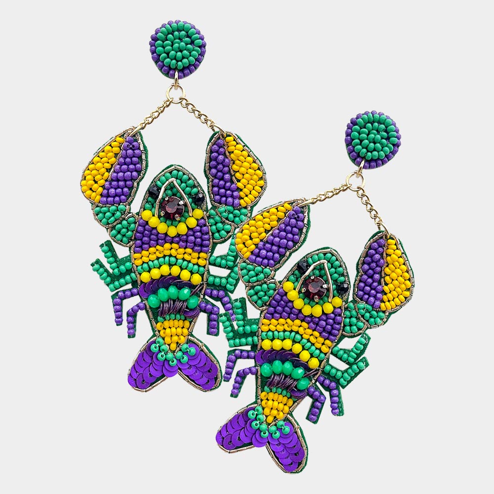 Felt Back Mardi Gras Sequin Seed Beaded Lobster Dangle Earrings