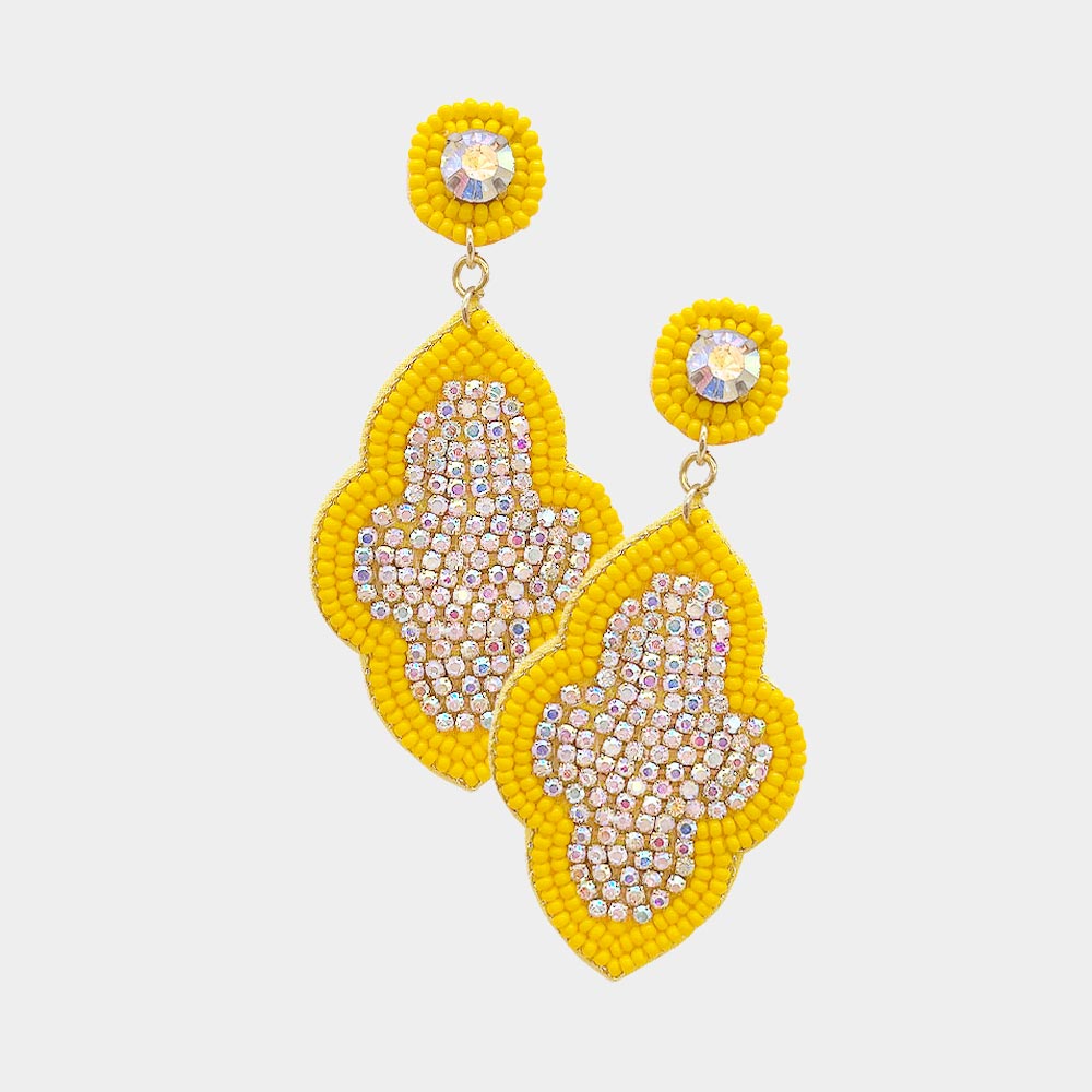 Felt Back Seed Bead Trimmed Rhinestone Quatrefoil Dangle Earrings