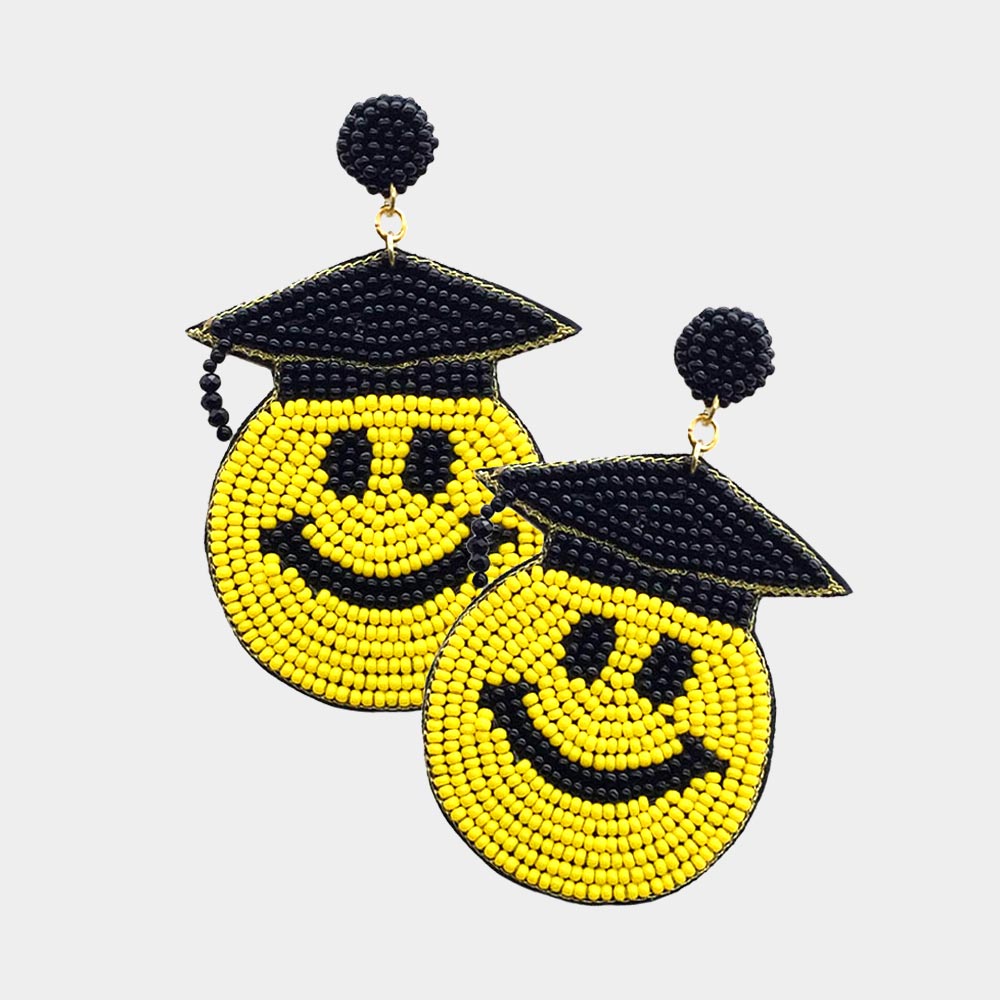 Felt Back Seed Beaded Graduation Smile Face Dangle Earrings