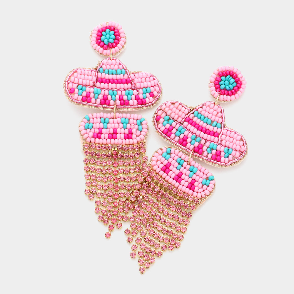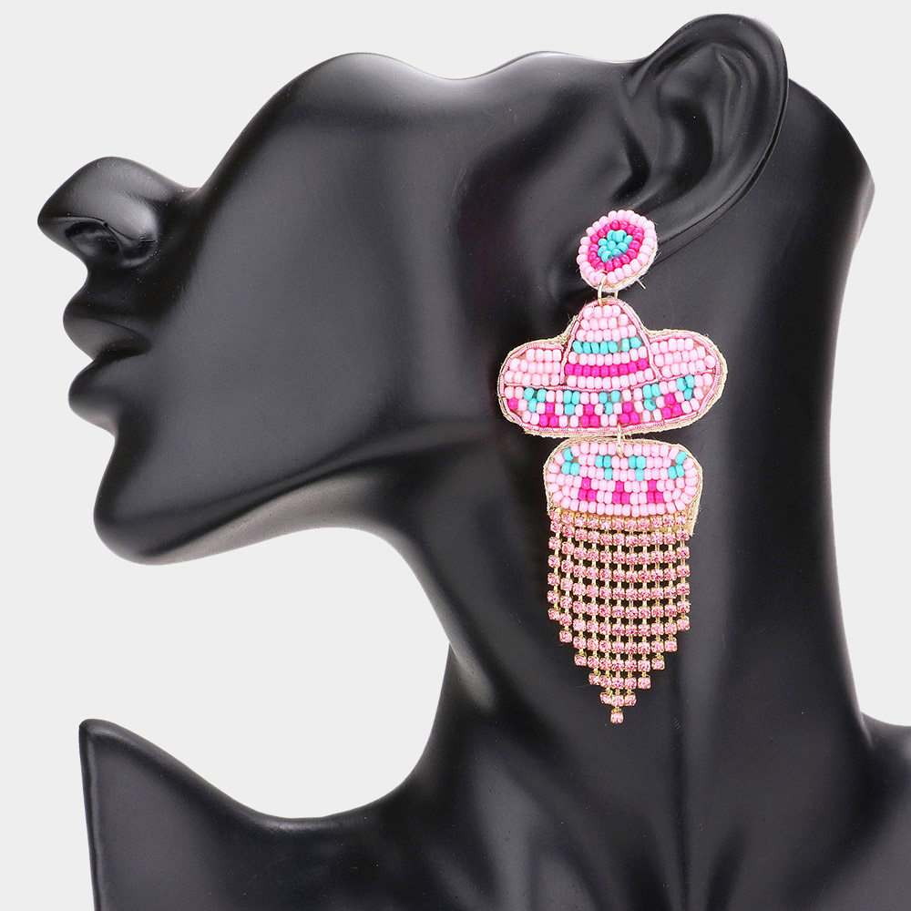 Felt Back Seed Beaded Hat Rhinestone Fringe Dangle Earrings