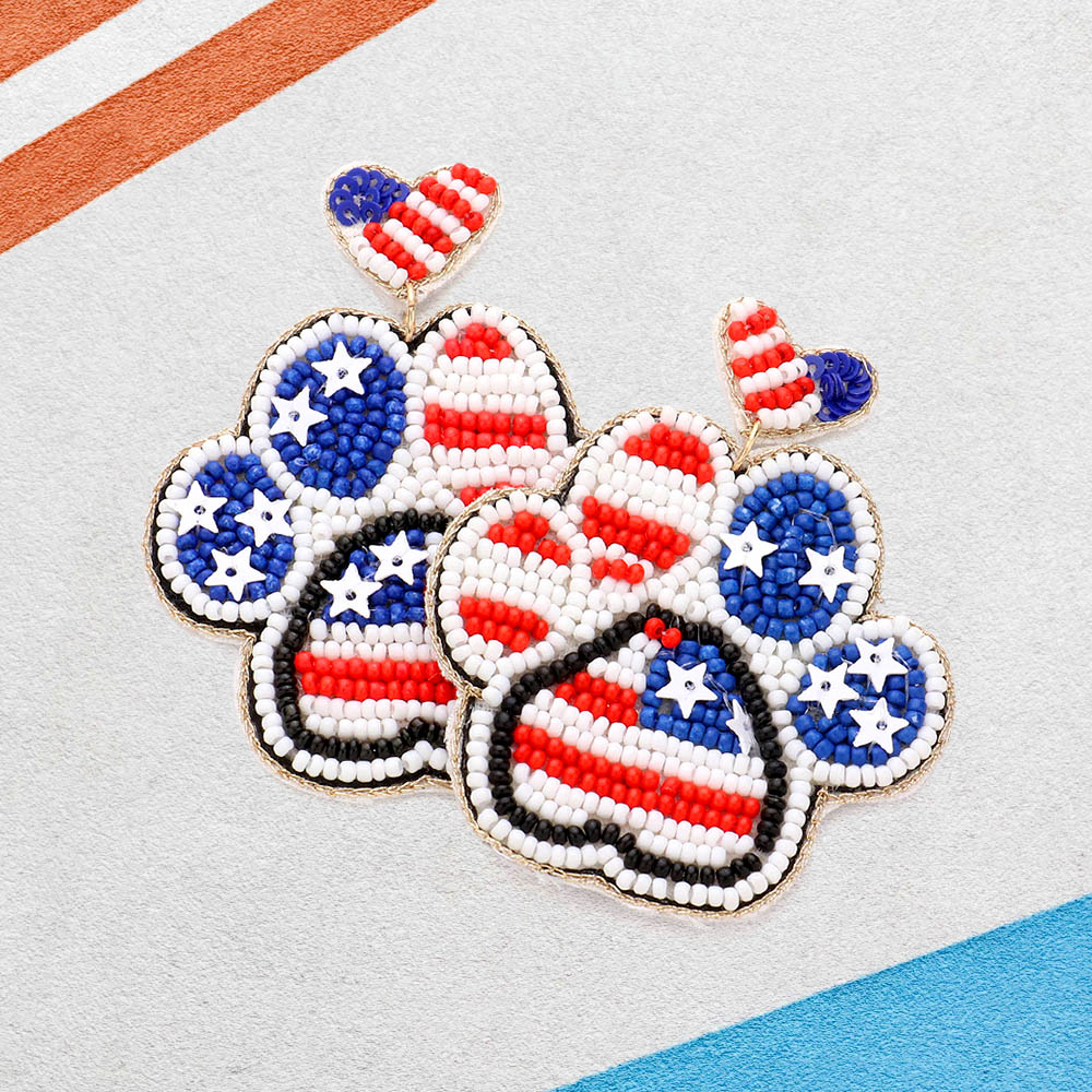 Felt Back Seed Beaded Heart American USA Flag Paw Link Dangle Earrings