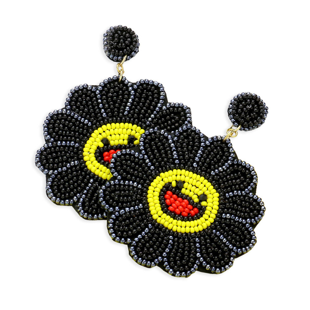 Felt Back Seed Beaded Smile Flower Dangle Earrings