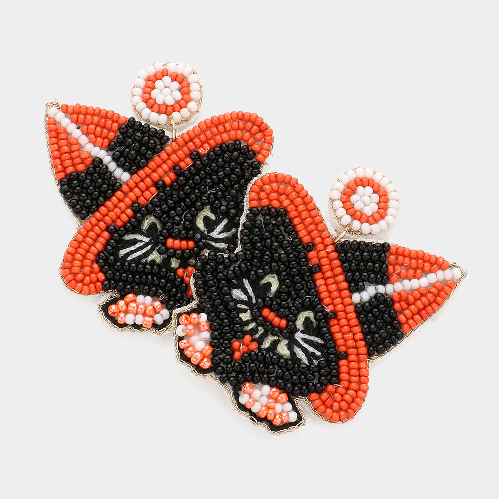 Felt Back Seed Beaded Witch Hat Cat Dangle Earrings