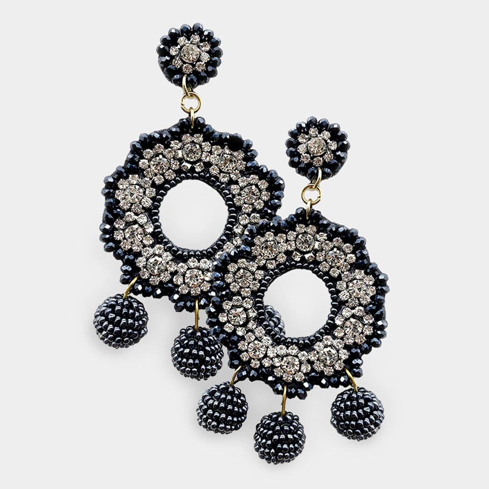 Felt Back Stone Embellished Floral Circle Triple Beaded Ball Link Dangle Earrings
